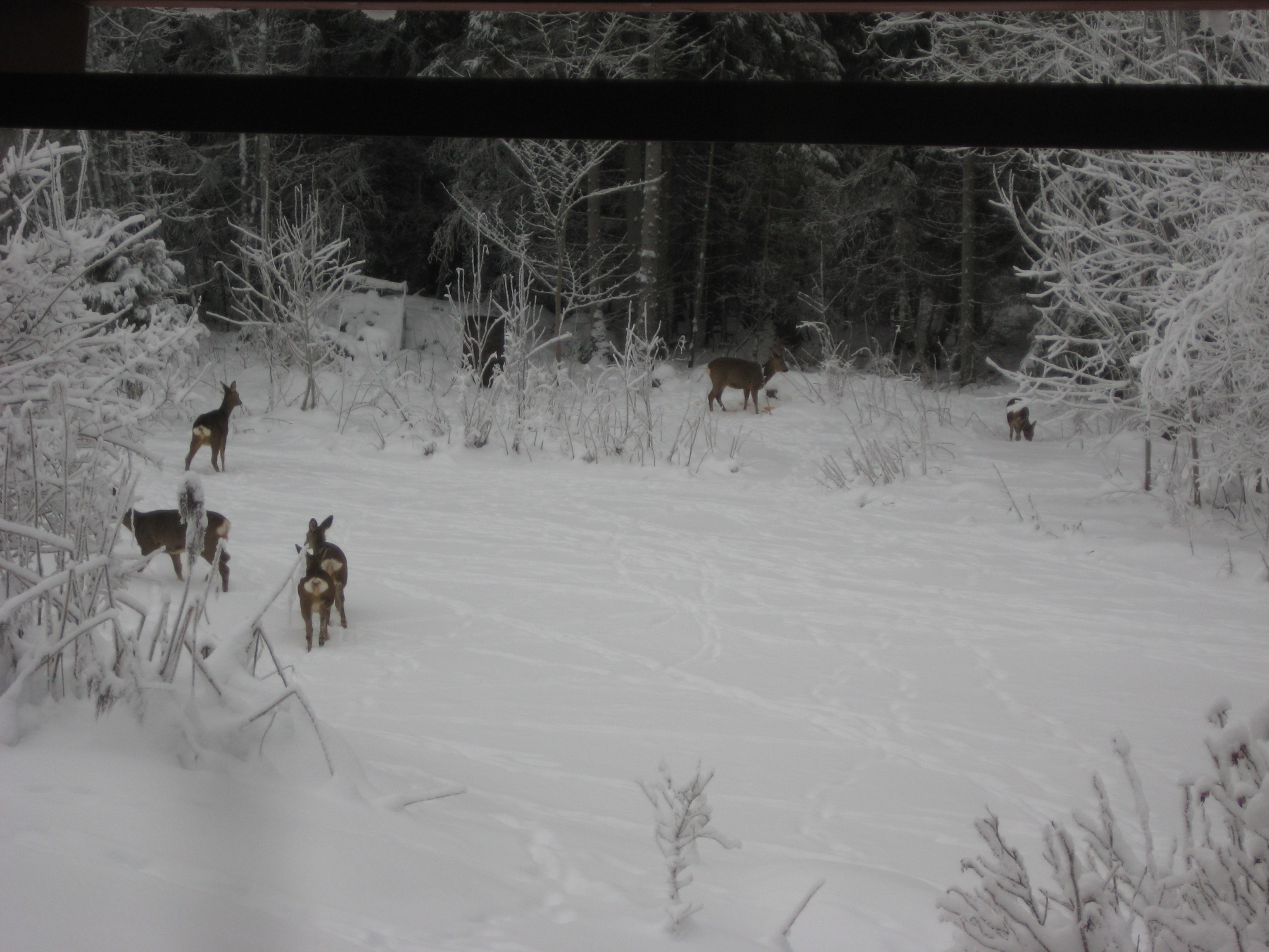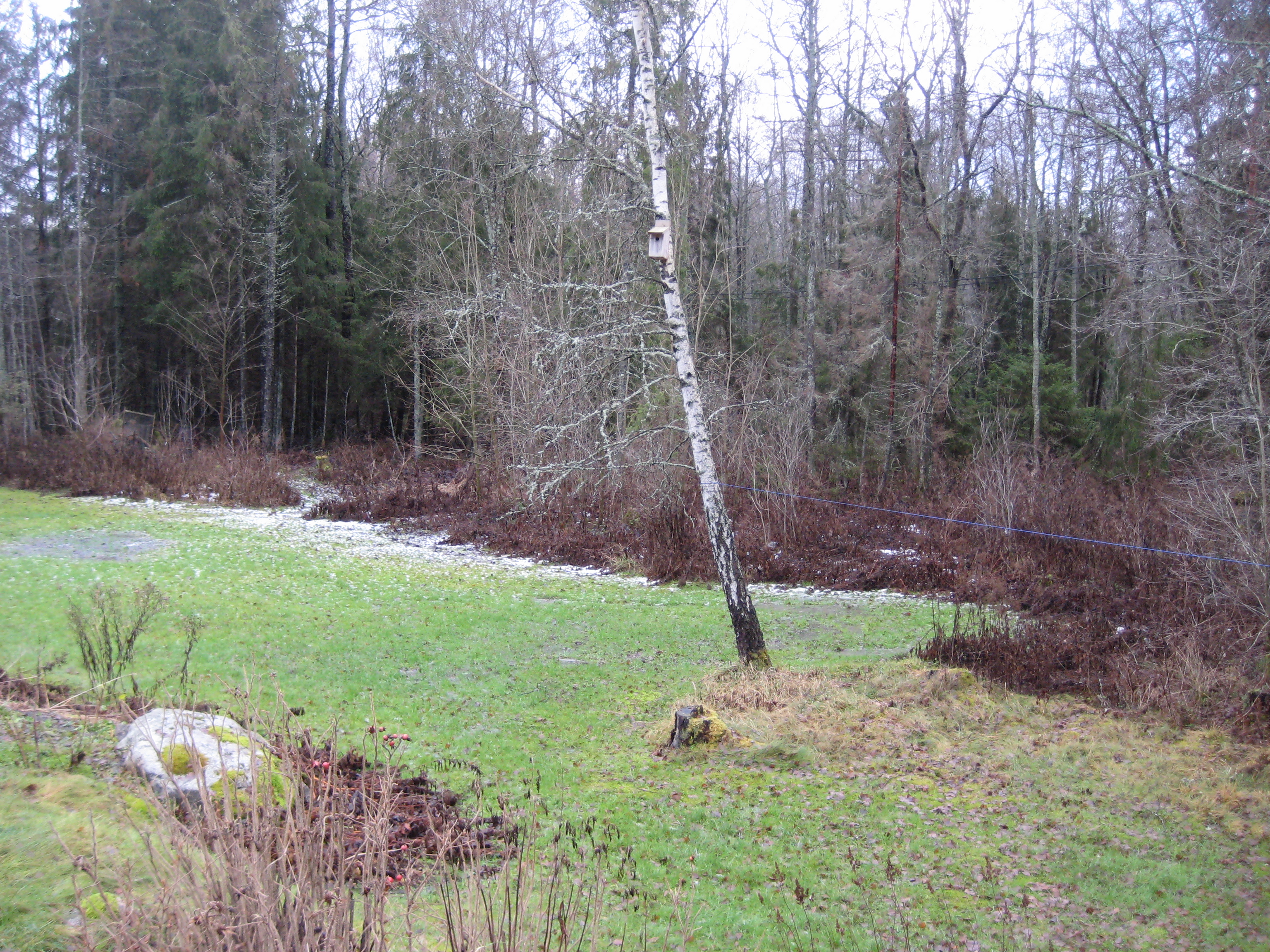 En ny affärsidé kom jag på när jag tittade ut idag, en ny tomtedräkt. Ja färgerna är det inget fel på men materialet. Riktigt hederlig galon vore perfekt med remsor av gamla PET-flaskor som skägg. Tog förresten ett kort i morse, det visar trädgården på baksidan av huset, mot skogen.