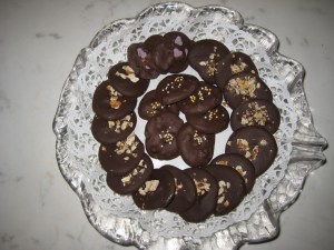 Recept: 200 gram mörk choklad med högt kakaoinnehåll, Smält över vattenbad tillsammans med 50 gram Marabou Schweizernöt. Klicka ut på bakplåtspapper med hjälp av en tesked, till små platta rundlar. Hacka en matsked valnötter smått och rosta dem i stekpannan. Strö över lite innan chokladplättarna stelnat.