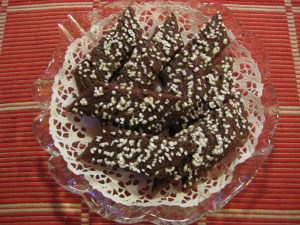 250 gram smör och 3 dl florsocker blandas väl. Tillsätt 5 dl vetemjöl, 3/4 dl kakao, 1 msk vaniljsocker, 1 tsk bakpulver. Dela degen i sex rullar i bakplåtslängd och platta till. Det blir 70 stycken kakor. Pensla med uppvispat ägg eller äggvita, strö på pärlsocker. Grädda 15 min i 175 grader. Skär dem i 2 cm breda occh sneda snittar medan de är varma. njut eller frys in.