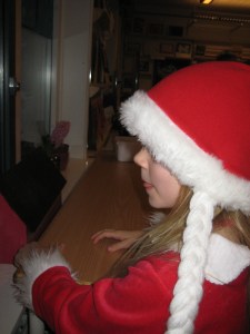 Här står Vanna och spanar ut genom fönstret, undrar nog om det är denna vägen tomten kommer tro. Igår diskuterade hon och jag om hur det förhåller sig med tomtens renar. Är det bara på julafton de kan flyga eller? Avslutningsvis drack vi kaffe som Vannas mormor hade med sig, fick även smaka pepparkakor som barnen bakat.