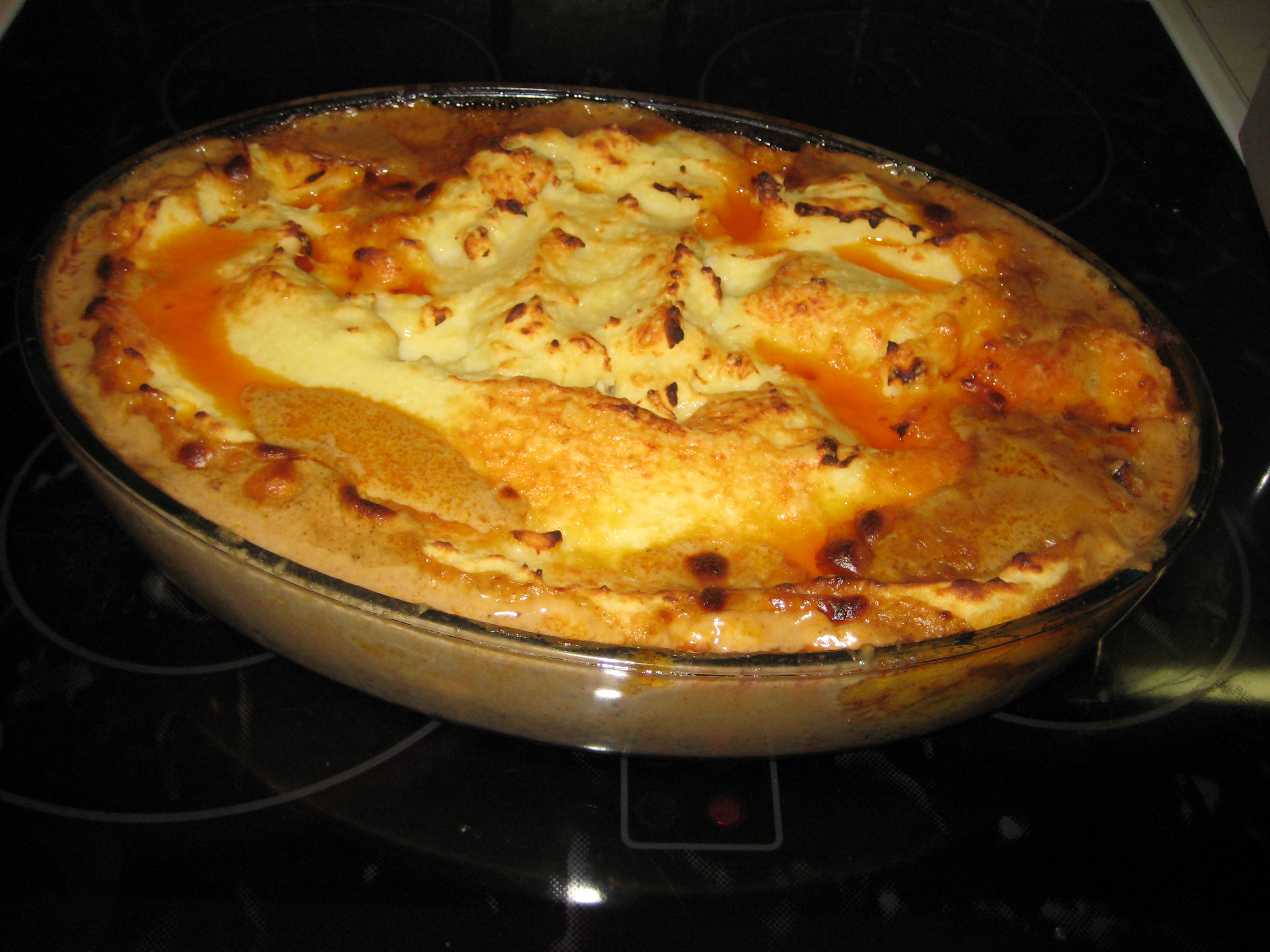 6 hg köttfärs, 1 finhackad gul lök, brynes tillsammans med 1 tsk salt och 1/3 tsk vitpeppar. Blanda det hela med 3 dl Creme fraiche med tomatsmak, 1/2 påse Tacokrydda, 1 liten bit finhackad purjolök och om man vill 1-2 grovhackade tomater. Häll ner färssmeten i en lite vid ugnseldfast form. Gör potatismos, häll över potatismoset jämt fördelat över köttfärsen, toppa med lite riven ost. Gratinera i ugn 200 grader cirka 15-20 minuter.