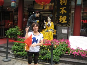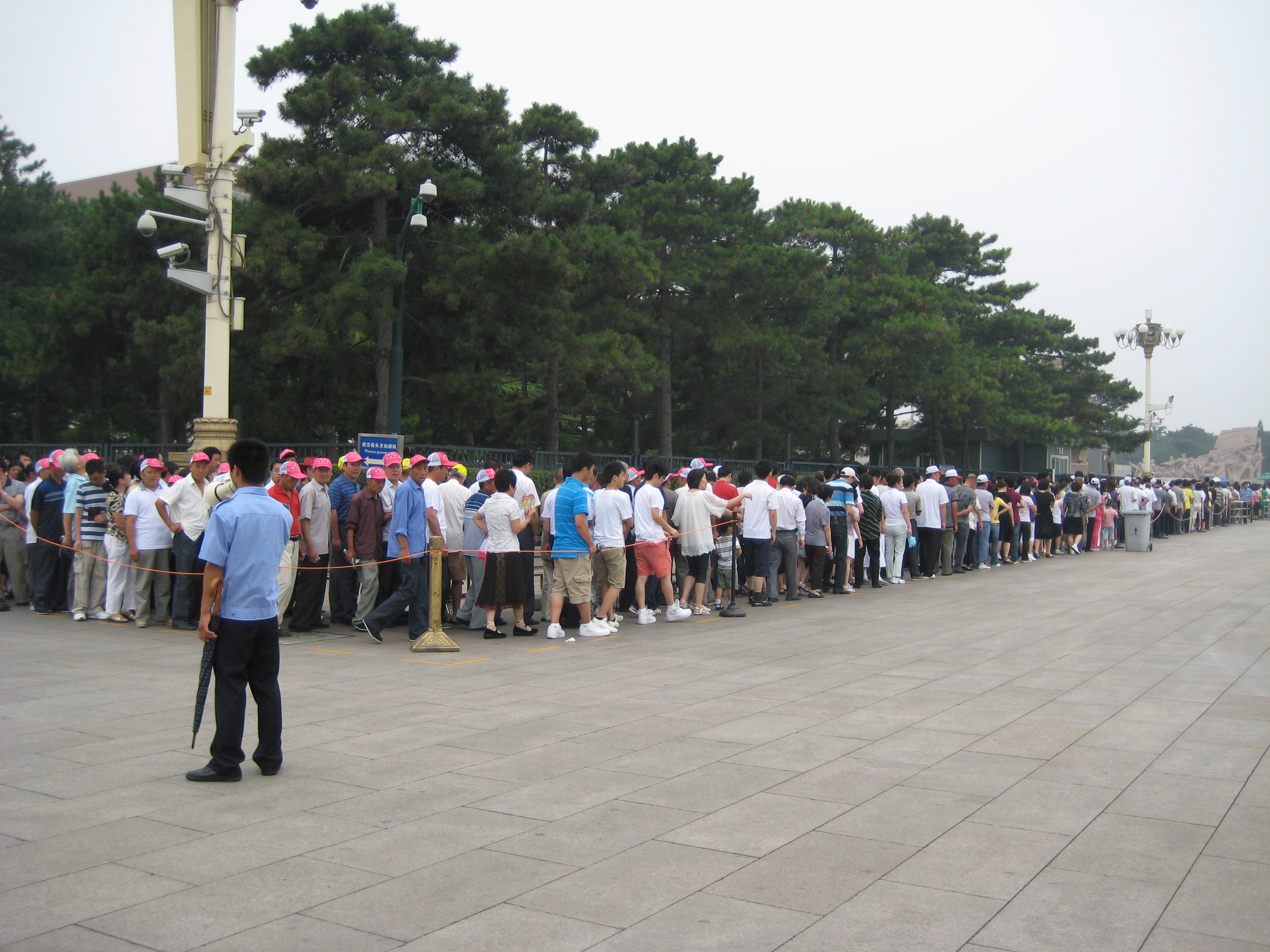 Som synes var det en ”jätterad” med folk som köade för att få komma in och titta på Mao Zedong som ju ligger där i sin glaskista. Innan man fick gå in skulle kameror och väskor lämnas in i luckan på en liten barack, detta gick förvånansvärt snabbt. Snabb var även kön, vi trodde det skulle ta timmar med tanke på kölängden, men inte. En del köpte blommor som de lämnade framför kistan när de kom in, jag fick en bestämd känsla av att dessa blommor åkte ut och in hela dagen, det blev säkert vinst på dem. Min största behållning var nog att jag lyckades få en av de stela vakterna att ge ifrån sig ett snabbt, men ändå leende.