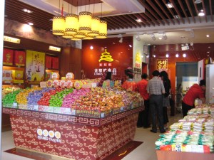 Som jag förut nämnt så är det mycket grön- och parkområde i Peking, så även här på torget. Eftersom vi inte hade ätit så mycket på morgonen, gav vi oss ut på jakt efter en resaturang eller café. Gick då förbi denna godisaffär som jag helt enkelt inte kunde motstå att titta in i. Frestande eller hur?