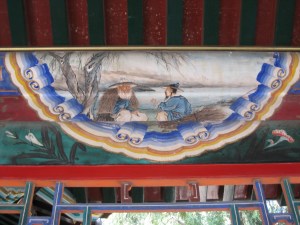 Innan vi gick in på området såg såg vi en bild uppklistrad på en tidningskiosk. Det var bröllopsfoto av kronprinsessparet. Lite kul. Ingången till sommarpalatset var väldigt pampig med sina utsmyckningar och färger. Vi började med att titta och gå igenom den Långa gången som är dekorerad med 8 000 målningar. Själva gången är 700 meter och den ligger utmed Kumminsjön. Gången byggdes för att kejsarinnan inte skulle behöva gå i regnet mellan sin marmorbåt och palatset. Här passerade det hela tiden en jämn ström av människor, undrar hur många tusen som gick där varje dag? Takmålningarna är helt fantastiska.