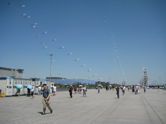Alldeles intill låg de här stora byggnaderna, vilka innehöll bostäder/hotell för de tävlande. Allt byggdes förstås nytt inför olympiaden, inte bara i OS-byn, utan i hela Pekings centrum. Tunnelbanan blev supermodern, när vi skulle åka vanlig tunnelbana var vi tvunga att lägga handväska och shoppingkassar för röntgen/säkerhetskontrol precis som på flyget. Det märkliga var, att trots att det var massor av människor som skulle med tågen, blev det aldrig några köer. På fotot nedan ser vi hur drakarna flyger i luften, detta är ett av kinesernas fritidsnöje, och utrymme att utöva drakflygning finns ju. Tittar man snabbt på bilden kan man tro att det är en sorts belysning, men icke. Välordnat, ja titta till vänster en hel rad med fräscha ”bajamajor”.