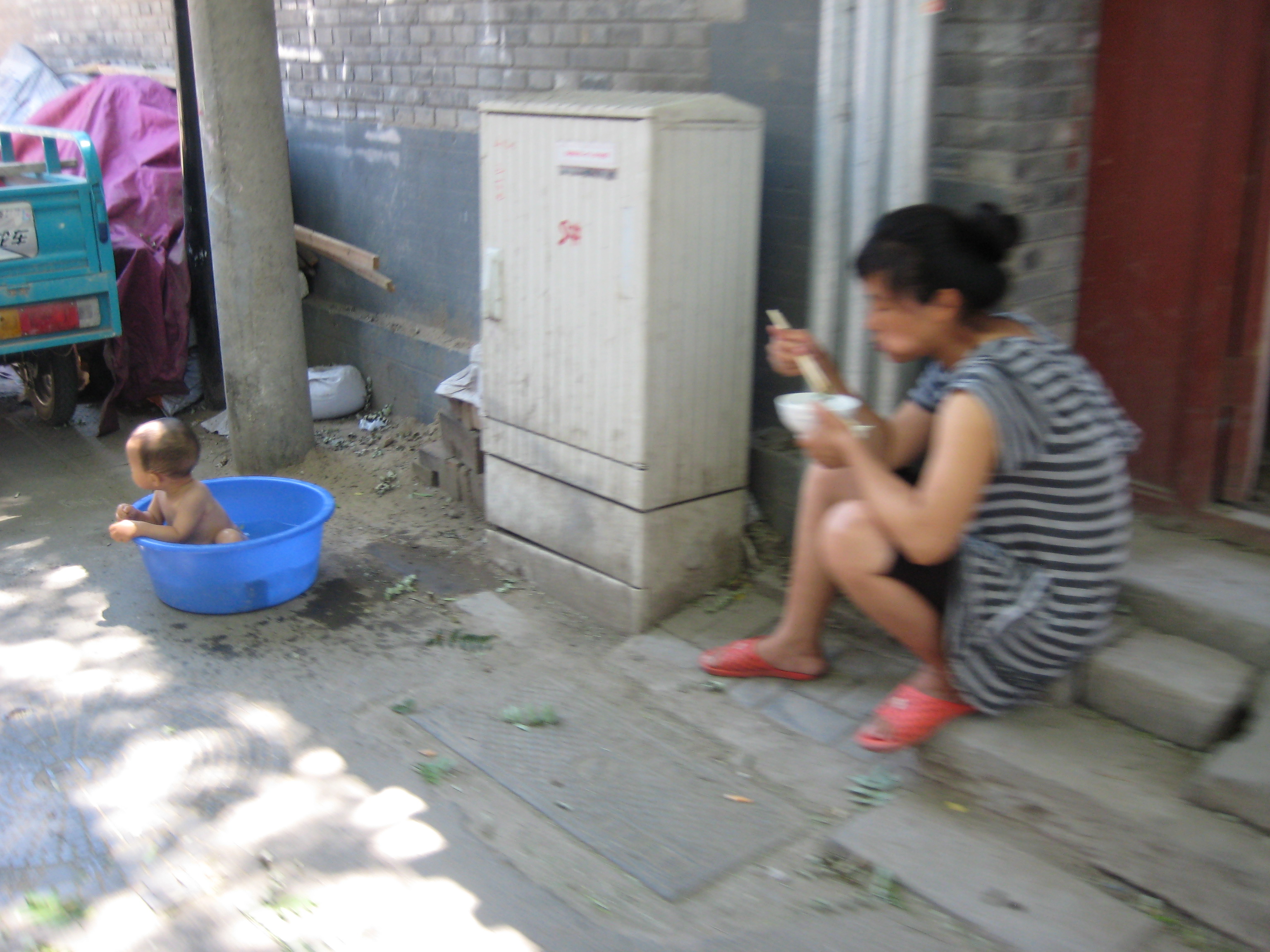 Hon passade på att låta barnet ta ett bad i sin balja under tiden. I morgon tittar vi på lite fler bilder som visar hur man lever i hutongerna.