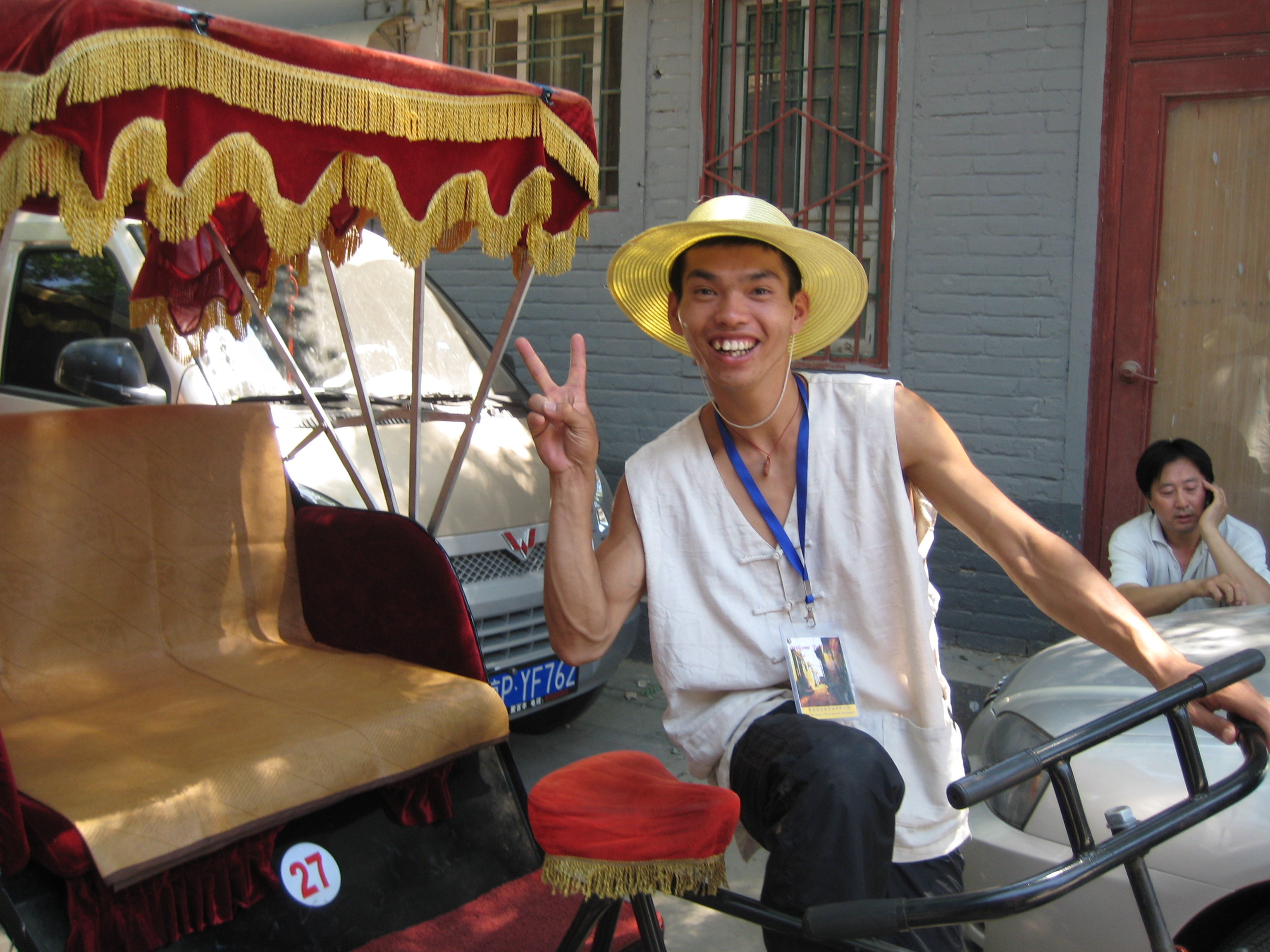 När det var lunchdags styrde vi kosan mot de gamla hutongerna, det finns dessvärre inte många kvar. De flesta revs i samband med nybyggnationen inför OS. Hutonger är små smala gränder med hus på båda sidor, husen är ofta inbyggda små innergårdar. Vi hittade en glad cykeltaxiförare som villigt körde oss till vårt matställe och värdfamilj.