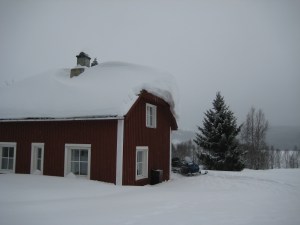 Nu är jag inte långt ifrån där LappLisa bodde, och de lappländska fjällen är verkligen snötäckta. Det snöar stora, stora flingor på tvären idag, och det sista dygnet har temperaturen legat runt 0 grader. Snömängden på taket har blivit ganska imponerande.