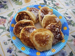 Vispa ägg och strösocker poröst, blande sedan i resterande. Värm upp en stekpanna och lägg i lite smör. Ta en matsked smet (ej för rågad) och lägg i pannan, platta till den lite. Lagom steka fyra åt gången. Stek dem någon minut på varje sida, det syns när de är klara.