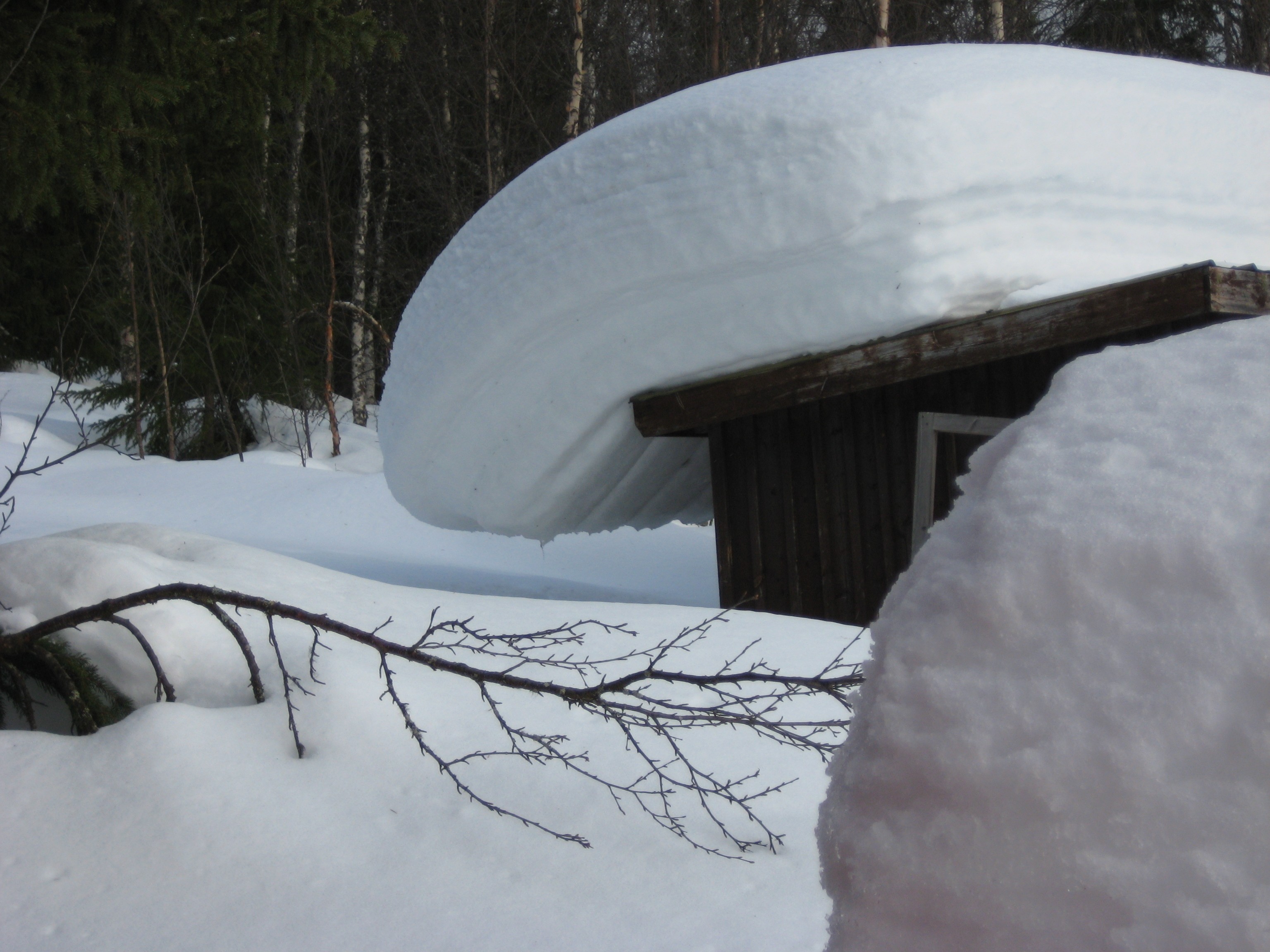 Gårdagen var verkligen skiftande, ena stunden massivt snöfall och nästa stund regn och storm. Man talar om höststormar men denna är värre. Idag är det full orkan och vi befarar att småvägarna har yrt igen. Nu har nästan all snö från hustaken ramlat ner, vi väntar bara på att det skall ramla från bastun vid sjön samt från den gamla vedboden/utedasset.