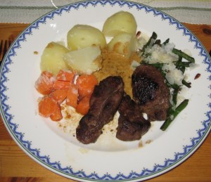 Ikväll blir det smalmat, men igår blev det lite festligt. Biff på älgkalv, potatis, morötter, lite creme fraishe utrörd med stekskyn. Plus min favoriträtt på sparris, jag har alltid en förpackning av den smala gröna, frysta sparrisen hemma.