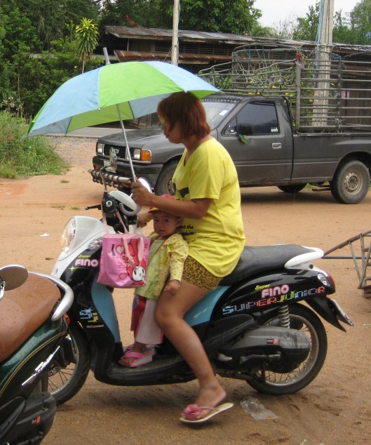 Trafiksäkerheten i Thailand blir jag lika imponerad av varje gång, kanske borde jag skriva ”avsaknad av” i stället. Den här mamman ställde sitt lilla barn framför sig, varorna hängde hon på styret, upp med paraplyn och sedan iväg. Styrde med en hand i regnet, hua. Nu blir det ett litet bad till, innan vi åker till Jacks resort för kvällens middag. Det var kallt i poolen, fick ta ett djupt andetag innan jag doppade mig.