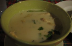 Soppa med kyckling, kokosmjölk med mera blev min beställning i kväll. 2 glas rödvin, 1 flaska sodavatten, 1 flaska vatten, 3 kokt ris, 3 olika varmrätter + dricks 500 THB var vad vi betalade för denna utflykt. Det kostar 40 THB per resa om man vill bli hämtad med bil till restaurangen, oavsett antal personer.