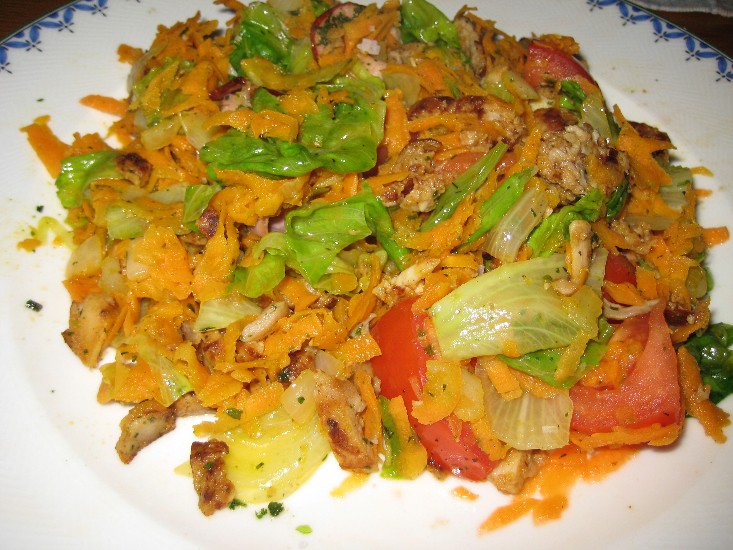 1,5 riven morot, 2 stora salladsblad i stora bitar, 1 msk hackad gul lök, 1 tomat i bitar, 1/2 hackad gul paprika, 1 rågad msk fryst Taco kyckling (perfekt ha en påse i kylen, finns i frysdisken), strö över Knorrs örtkryddor och stek allt snabbt med 1 tsk olja i en wookpanna. Ringla över lite olivolja och strö över lite havssalt. Perfekt med varm sallad när det är lite kallt ute, eller om man vill att det skall kännas lite matigare.