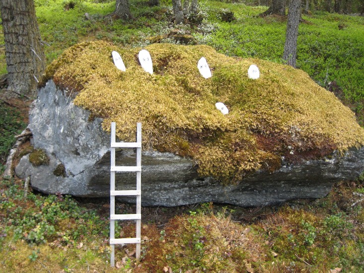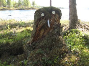 Här är ytterligare en liten gubbe som Bachus nosar på. Det är ju faktiskt ett trevligt initiativ att ställa ut dessa figurer, ganska enkla men gläder säkert alla som går förbi och ser dem. De dyker ju trots allt upp på en skogsväg som ligger långt från ära och redlighet, som det heter. Dessutom tips på ett kul pyssel för alla barn under sommarlovet, lite fina stenar och lite hobbyfärg är allt som behövs. Skall nog göra några med Viggo och Vanna, de gillar att pyssla. Figuren nedan får vi nog avstå från, blir nog svårt hitta en bra stubbe.