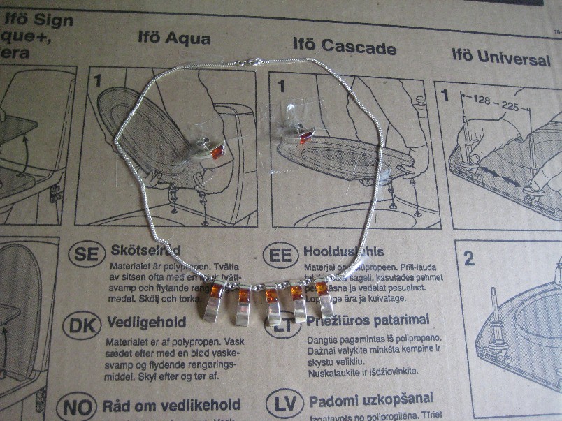 Present skall det vara när man fyller år, Rolf och jag hade svårt att lista ut något eftersom önskelistan var tom. Björn föreslog ett nytt toalettlock (jättekul). Sagt och gjort det blev ett sådant inköpt, se vänster bild. Hur gör man en sådan present rolig, jo man tar ett silverhalsband med bärnsten och tillhörande örhängen. Sätter fast dem på baksidan av kartongen. Genast mycket roligare, fast kanske ett ovanligt sätt att slå in ett halsband tillika toalettlock på.