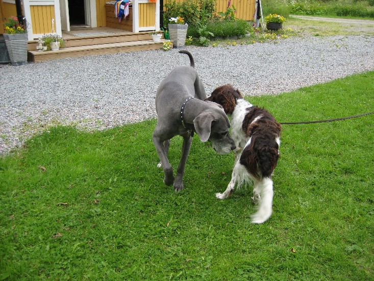 Alla barnen badade i baddammen och badtunnan, lite fotbollsspel, lagom hund träffar stor hund (Grand Danois) alltid trevligt med nya hundkompisar. En trevlig sommardag och jag tror en trevlig överraskning för födelsedagsbarnet.