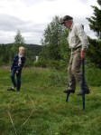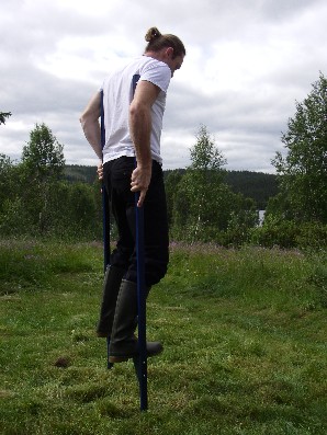 Trodde att jag köpte styltorna för att de små skulle ha lite roligt, men icke. Jag tror att Rolf och Björn hade väldigt roligt när de prövade. Måste väl säga att de var ganska duktiga på att promenera runt i en ganska så ojämn terräng. När herrarna lekt klart blev det en liten tripp till Vilhelmina, passar på medan solen skiner och det är varmt. Lite mat på uteserveringen, m.m. Det blir nöje resten av dagen, så vi hörs igen i morgon