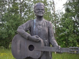 Varför, jo en gång bodde det en dam i ett hus i den lilla byn, hon hette Anna-Lisa Öst. Kanske är hon mera känd som Lapp-Lisa, hon föddes den 8 oktober 1889 i Marks kommun utanför Vilhelmina. Hon kallades för Sveriges sångfågel, tant Barnatro m.m, många är de som har hört hennes sjunga eller åtminstone hennes sånger. Denna staty står utanför ett litet museum man har låtit uppföra i hennes hemby.