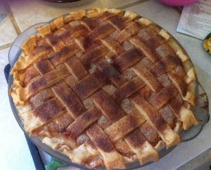 3. Make lattice top with remaining pie crust dough. Mix together sugar, cinnamon
