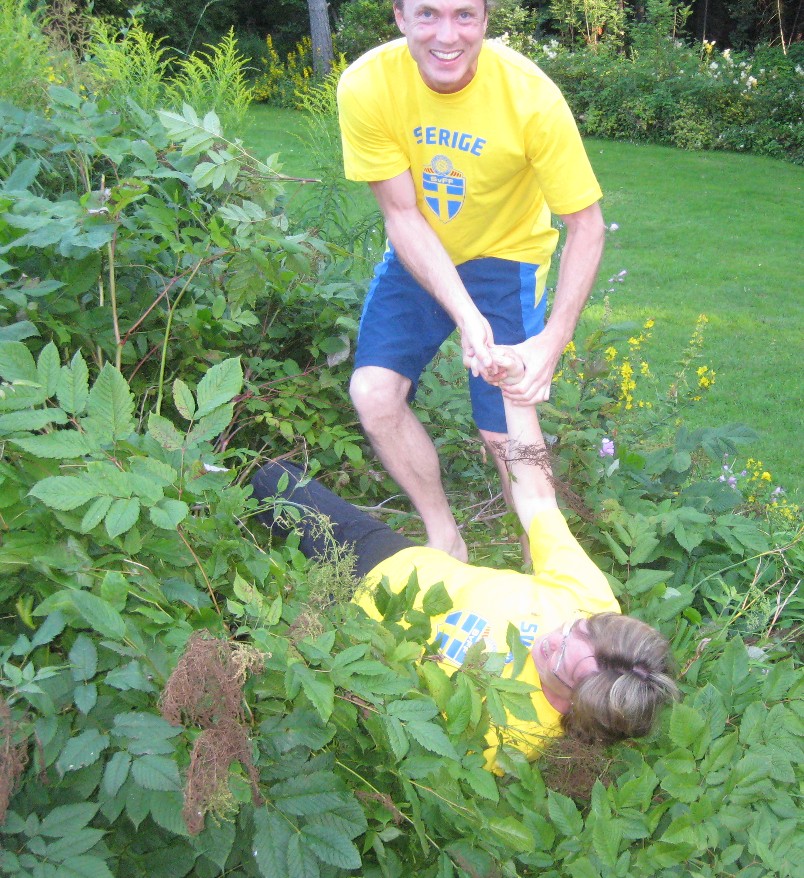 Men det märktes när de kom, när hunden öppnade dörren stod de där, iklädda gulblå Sverigetröjor. De har ofta lite hyss för sig. Även Rolf och jag fick var sin, vi förevigade det hela på foto, vilket blev extra roligt. Varför? Jo när vi var klara skulle vi spexa lite och jag ställde mig bakom en hög buske, trillade och kom knappt upp på grund av allt skrattande.