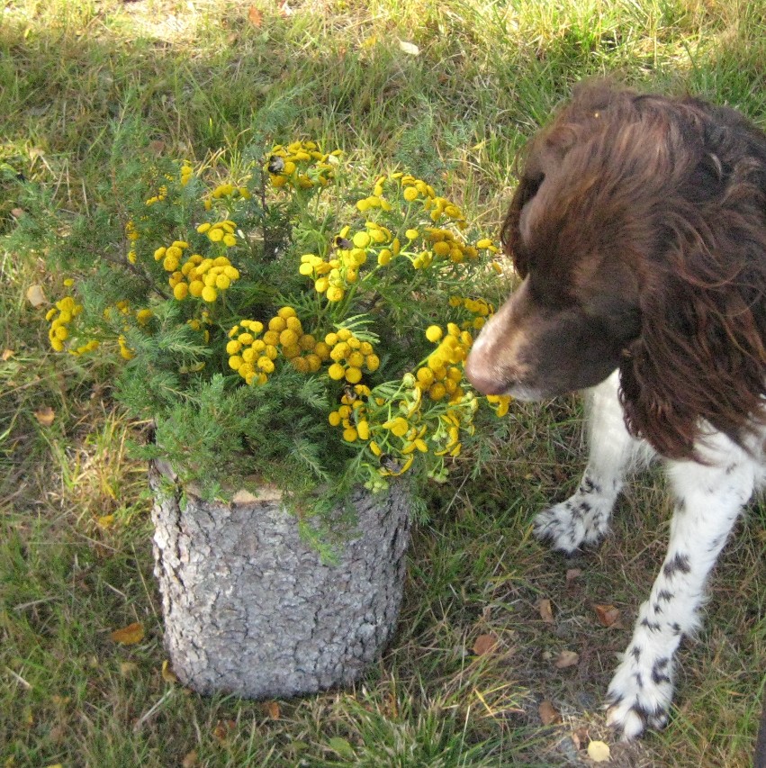 Jag har tidigare skrivit om en dam som bor efter vägen, hon brukar förgylla tillvaron för sina medmänniskor genom att placera ut lite roliga prylar efter vägen. Här är det en kruka, gjord av en bit gammal trädstam. I den har hon planterat en blomma vid namn, Renfana.