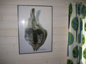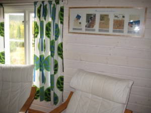 Då är det dags att lämna stugan för den här gången, innan vi skall åka hem brukar jag kolla runt för att se att allt är OK. Ibland blir man lite nostalgisk när man ser sig om. I det här huset bodde det fram till 1950 en familj med nio barn. Mamman var ensam med dem och man kan bara tänka sig vilket hårt liv det måste ha varit. För några år sedan gjorde vi iordning ett nytt rum på övervåningen, det blev 42 kvm, ljust och trevligt. Men vilket arbete, det visade sig när vi tagit bort ett kraftigt trägolv, att det var isolerat med sågspån. Vi bar ut en ofantlig mängd säckar med sågspån. Ibland allt detta hittade vi små saker, en sko, en liten schackpjäs i trä, gamla kuvert m.m. Rolf tog lite av det och gjorde en tavla.