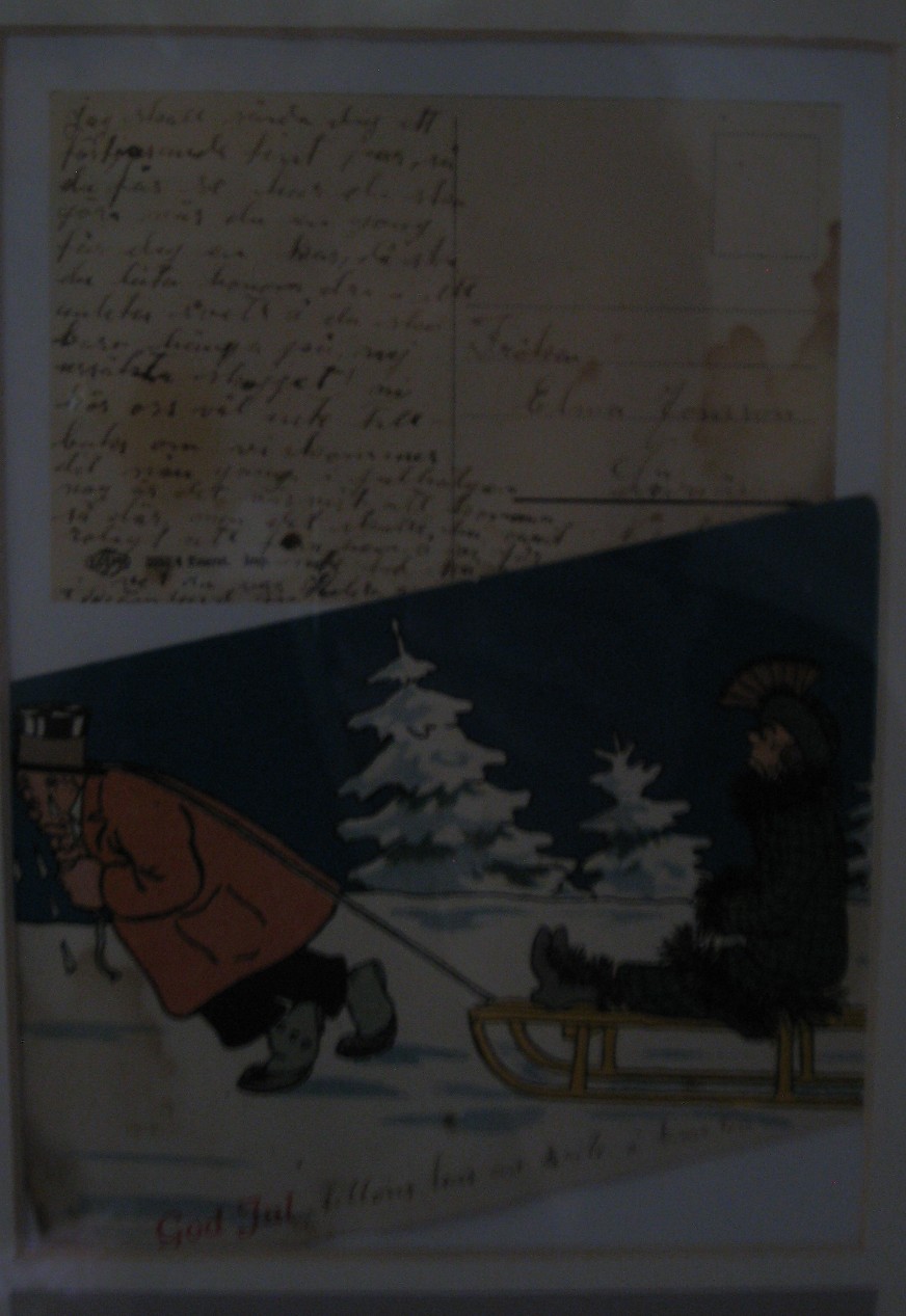 Den blev så bra, att vi satte upp den på väggen. Bakom glas och ram sitter nu tapetprover, någon bit från en katalog samt julkort. Ett av julkorten är skrivet av en av döttrarna i huset. I somras fick vi spontanbesök av ett par vi aldrig träffat förut, det visade sig att mannens mormor var född i vårt hus. När vi visade tavlan, berättade han att det var hans mormor som skrivit kortet, visst är det fantastiskt.