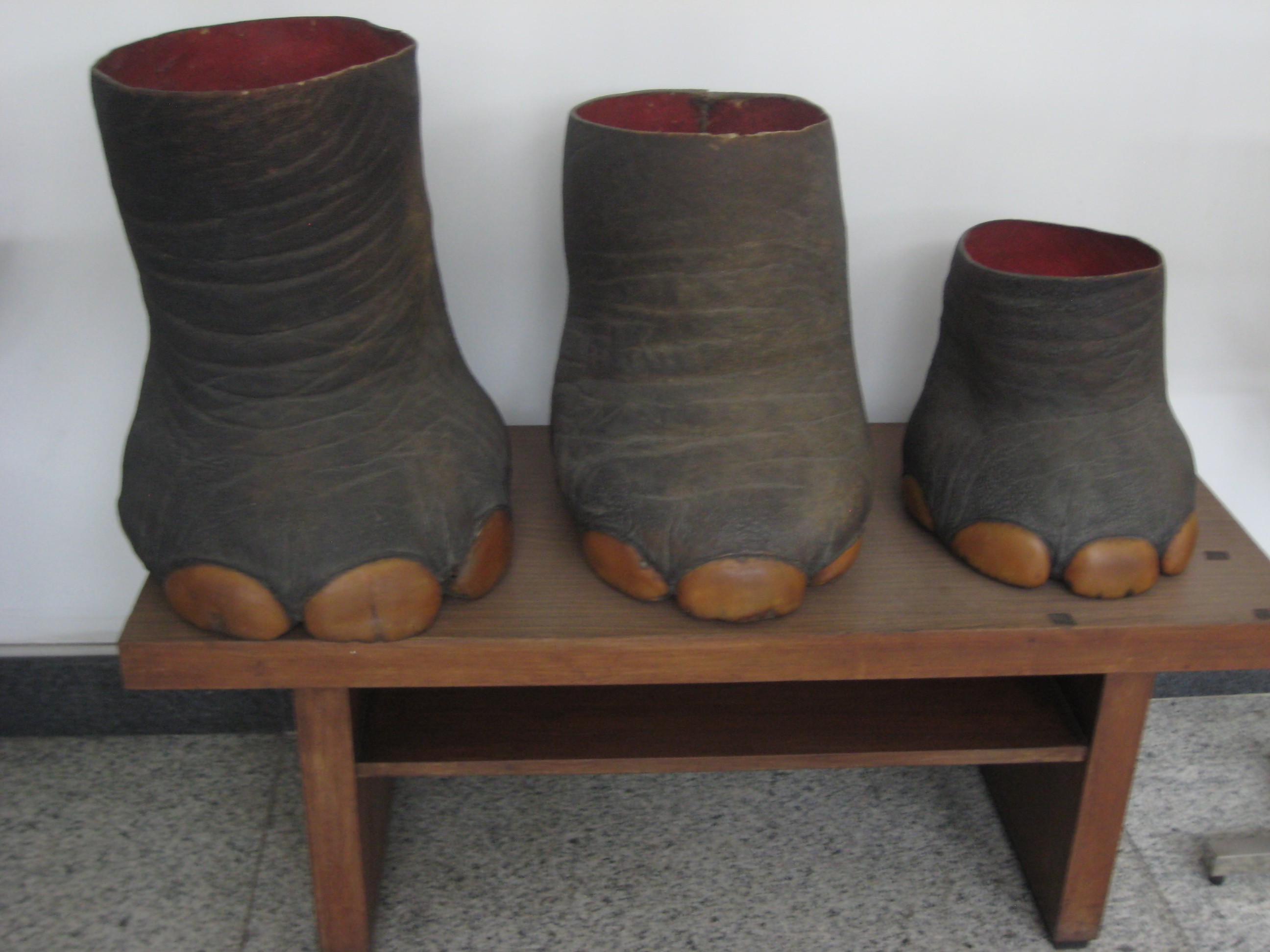 Narurligtvis kan man titta in i presidentens arbetsrum, sovrum, spelrum, och det finns förstås en stor biosalong och ett rum för kasino. I en sal hängde jakttrofféer, en del av dem var gåvor av besökare från olika länder. Det som slog mig, var att man här inte bara sätter upp hornen som vi gör, utan även har kvar svansen. Lite annorlunda.De här elefantfötterna tycker jag ser lite makabra ut, minns dem från mitt förra besök där. De hade med andra ord inte gått sin väg.Översta våningen inrymmer en danssalong där står också en vacker flygel. Utanför finns den stora helikopterplattan, detta så att presidenten lätt skulle kunna lämna byggnaden.