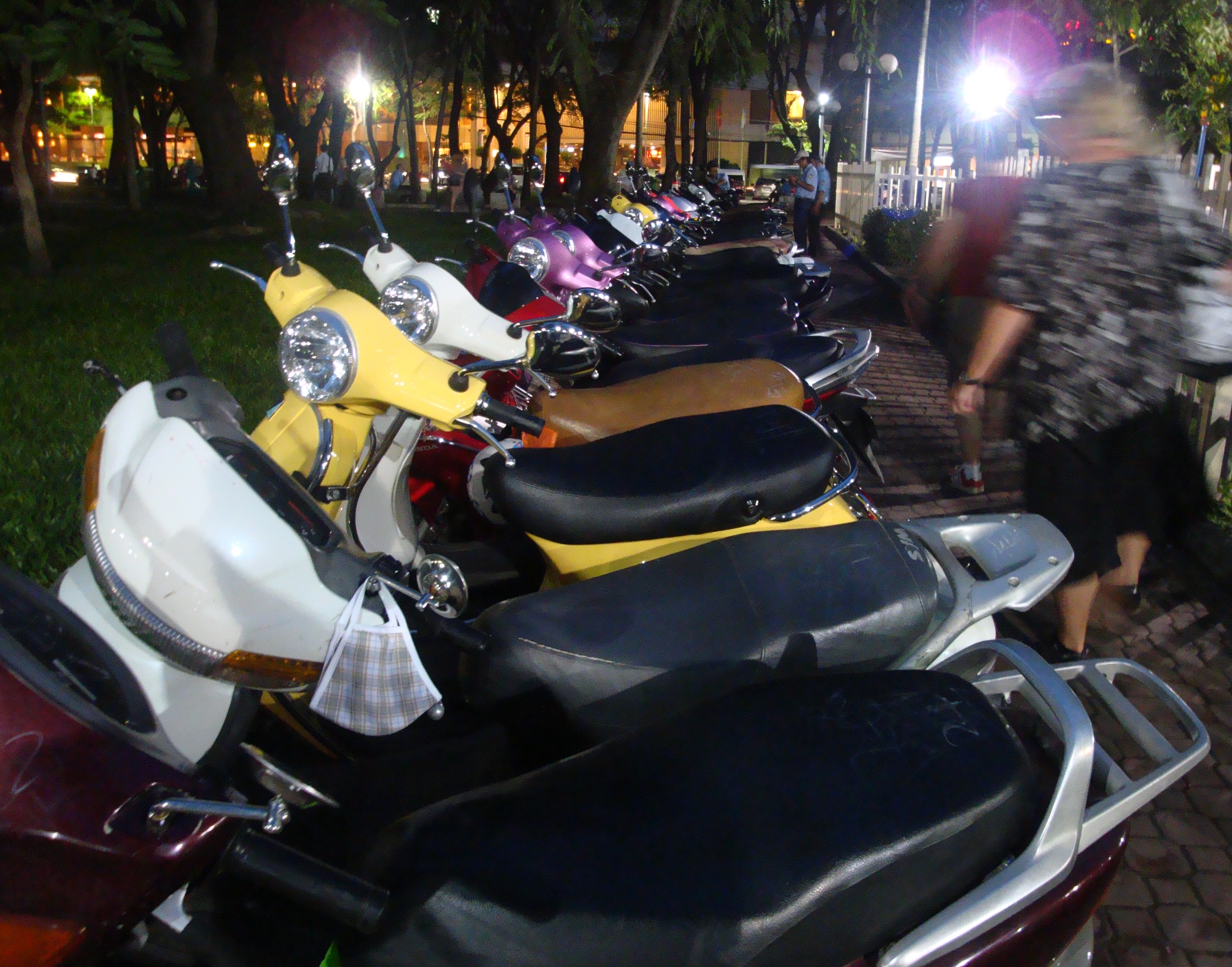 Vad gör man en kväll i Saigon, naturligtvis finns det säkert en del barer och dylikt om man nu gillar det. Om man nu inte tycker om den typen av förströelse utan hellre vill göra det vietnameserna själva gör. Det man ser är att många går mot grönområdena som finns lite här och var. Det är konstigt att man i många länder i asien har stora gröna parker mitt i storstäderna, vilka man verkligen vistas i. I motsats till här hemma. Här nedan ser man hur motorcyklarna står snyggt parkerade på därför avsedd plats.