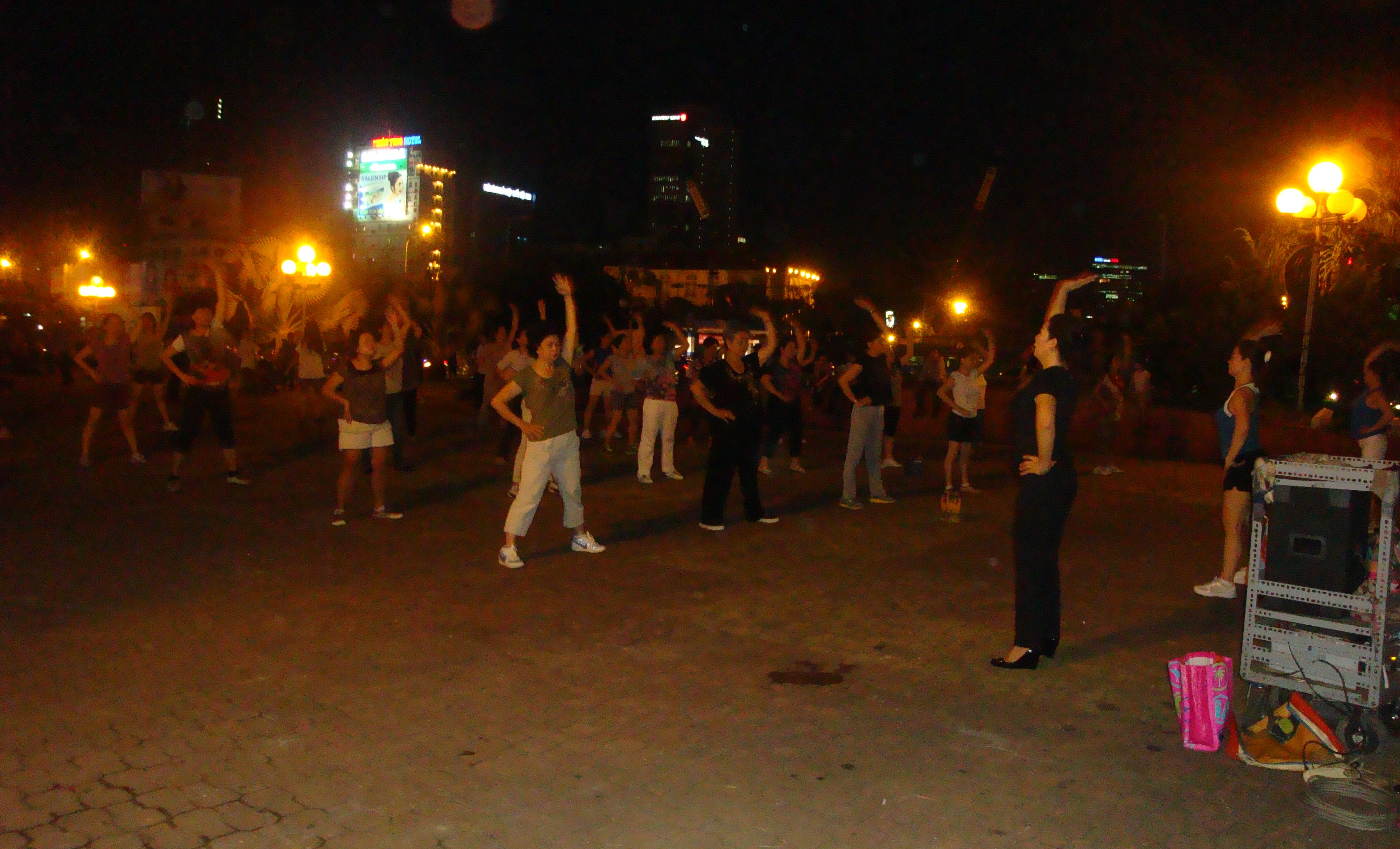 Gillar man inte det, finns det vanlig typ av gymnastik. Här är det ingen som klagar på oljud, en högtalare av stort format släpas hit varje kväll.