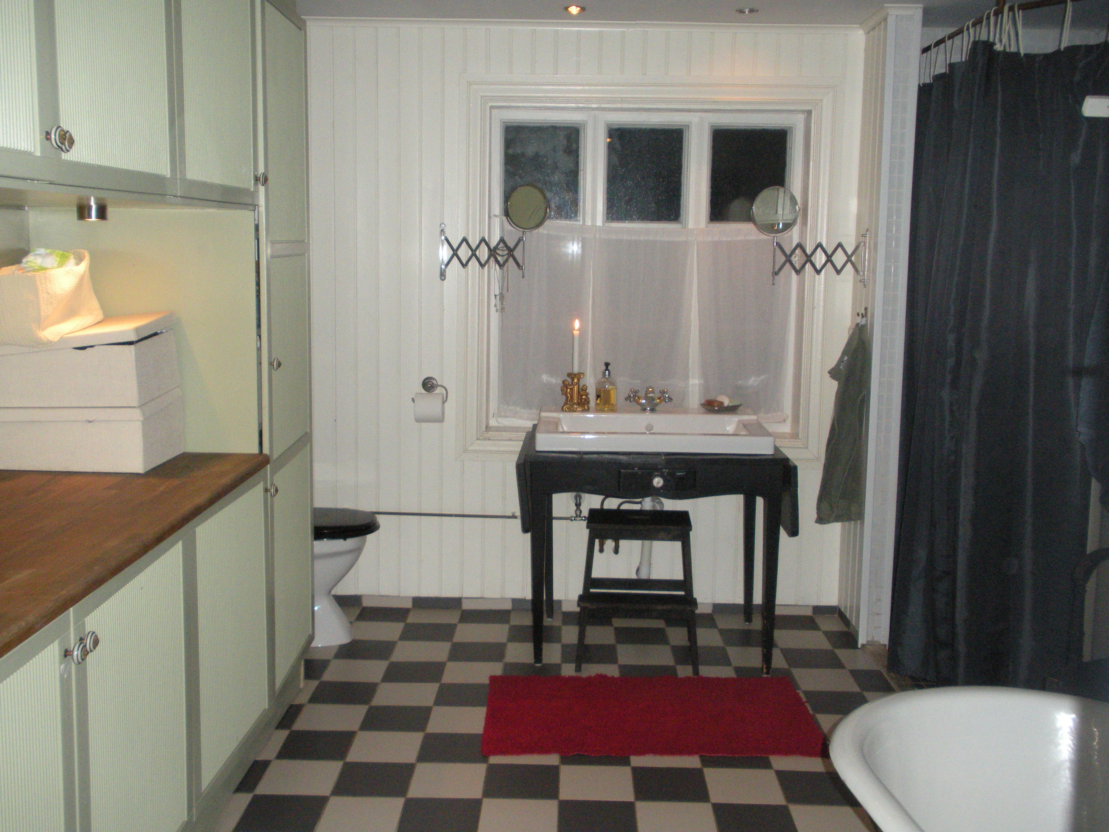 Här nedan fick vi visst en bild av badrummet, det är annorlunda stort och roligt men visst är det ett riktigt badrum i normal storlek.Tycker det ser sä härligt gammaldags ut, man får lät lite nostalgiska tankar och drömmer sig nästan in i romanvärlden.