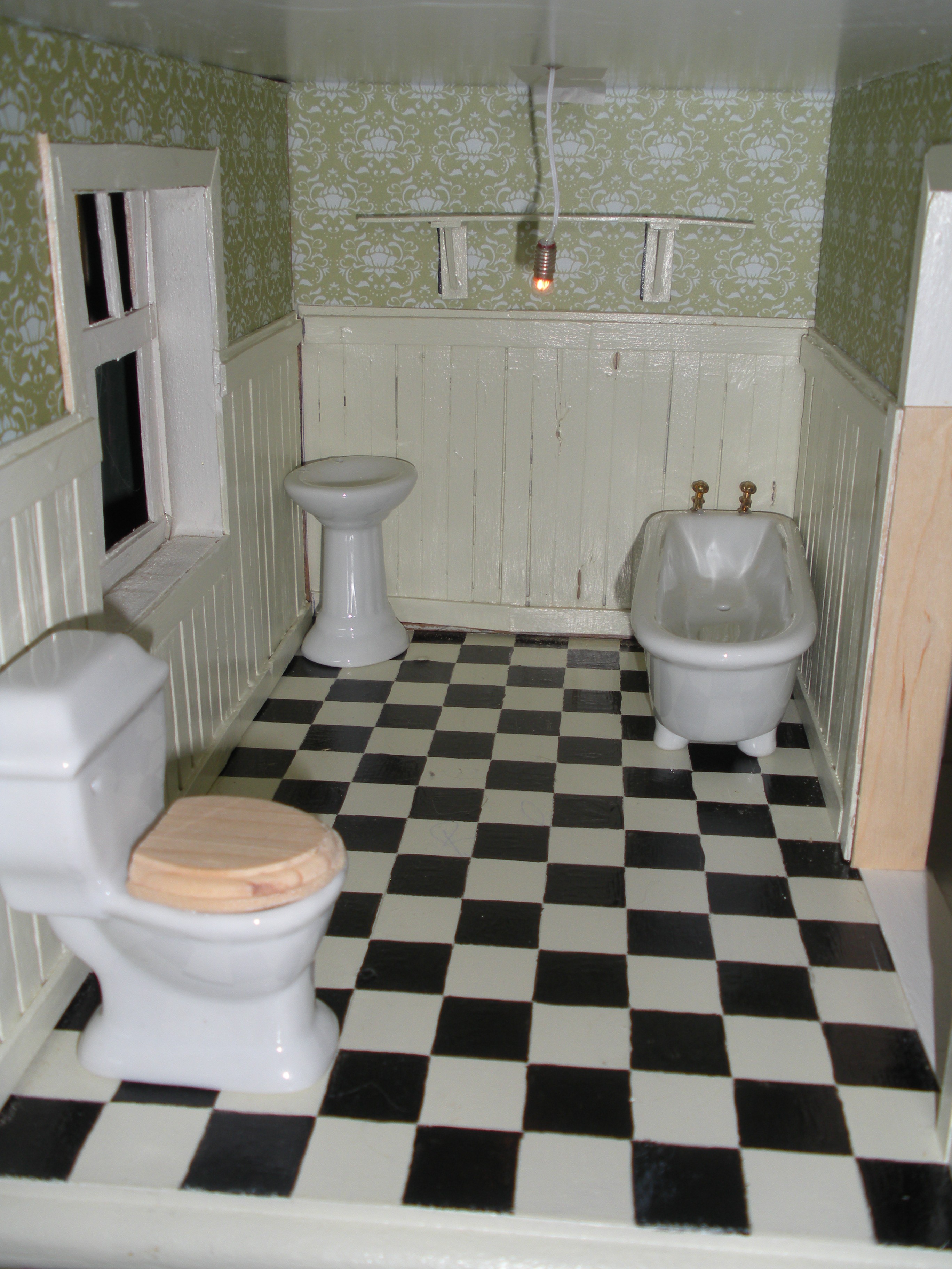 Man kan ana att det egna badrummet i huset har varit förebild. Titta på golvet som målats för hand, ruta för ruta. Panelväggen har gjorts från en massa glasspinnar inköpta på Panduro. Tapeterna kommer från scrapbookingpapper inhandlade i samma affär. Jag förstår att det måste varit en superjulklapp för en liten tjej. Nu ni, här har ni världen utmaning, tillverka ett sådant här till barn eller barnbarn.