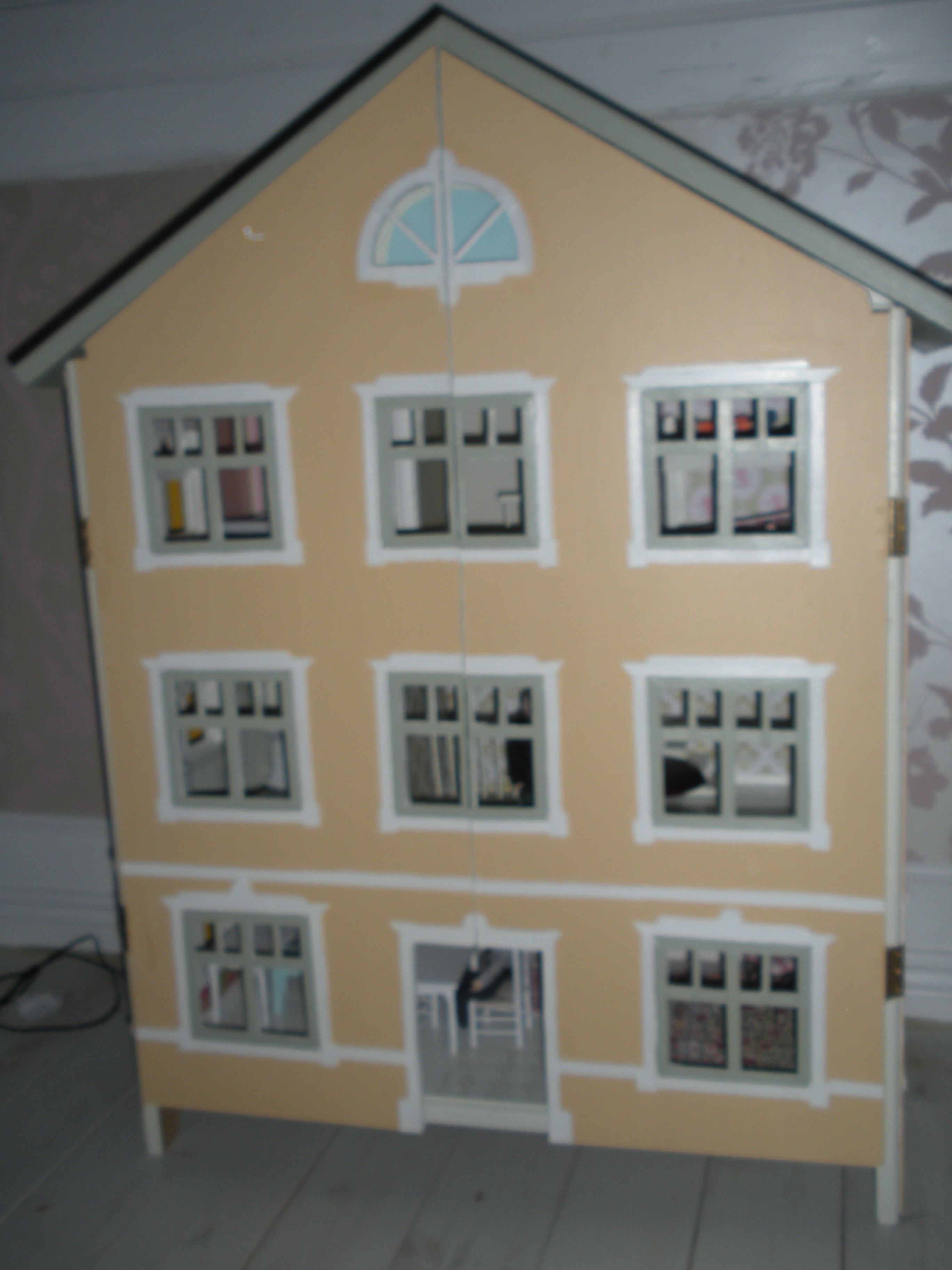 Idag har tiden bara flugit iväg, ja kvällen också för den delen. Vi har varit och gratulerat ett av barnbarnen, Lilly som fyllde 3 år för ett tag sedan. Hon var mycket pratsam och uppskattade presenterna. En av dem, ”batterihunden” vägrade dock att fungera så den förpassas tillbaka till affären. Lilly visade stolt upp en av sina julklappar, ett dockhus som hennes mamma har gjort. Det var så charmigt att jag bara måste visa några bilder. Kolla bara på exteriören.