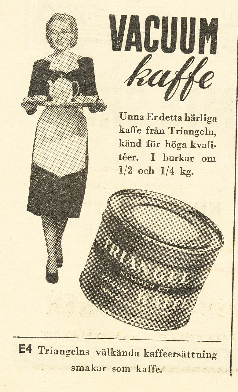 En gammal annons om kaffe, det står faktiskt ”unna er detta härliga kaffe”. Här står det längst ner ”Triangelns välkända kaffeersättning smakar som kaffe” ärligt i motsatt till vad som står på dagens kött/hästpaket. Antar att det innehöll sekoria för det var väl det man smaksatte kaffet med under krigsåren.