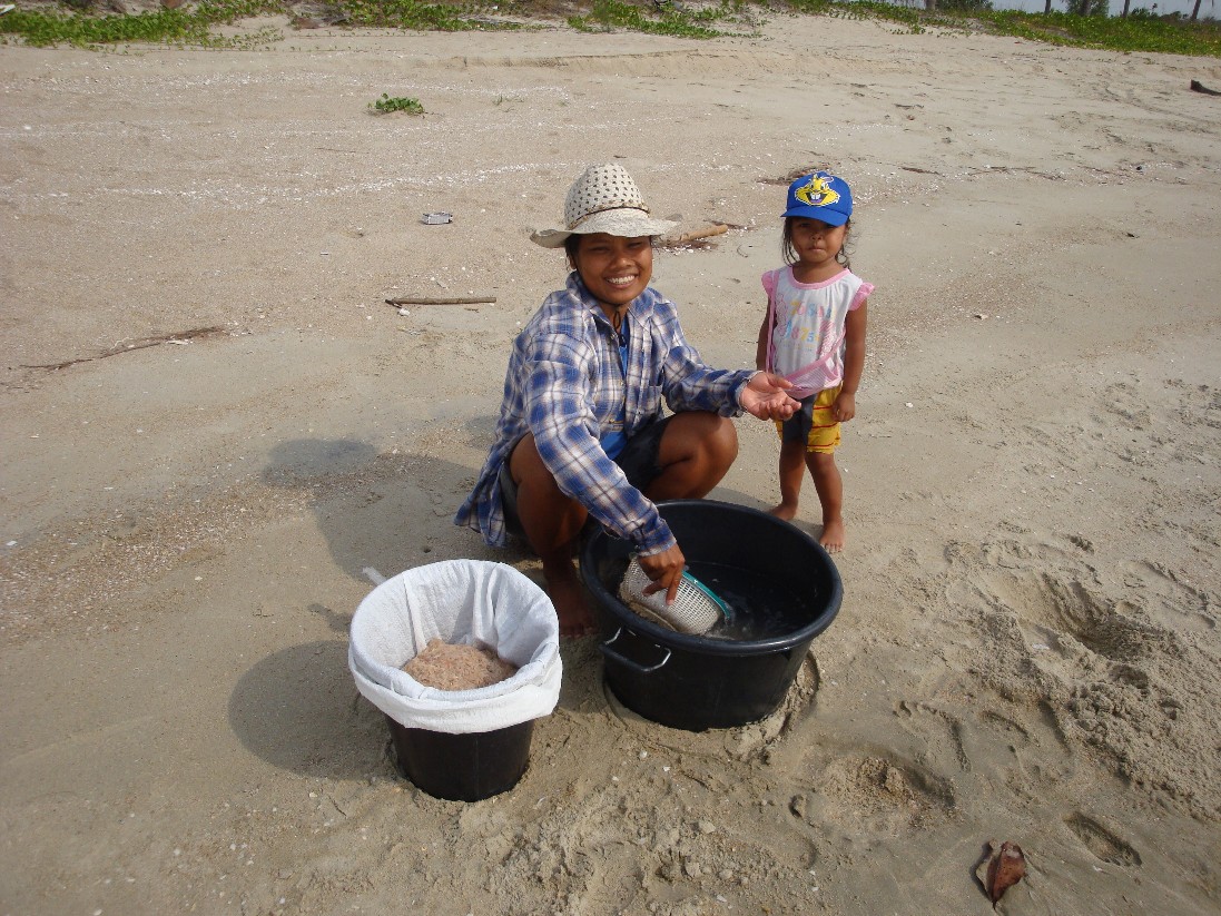 Stranden som oftast ser tom ut trots att det ibland är en hel del turister där, är väldigt behaglig att vandra på. Idag såg vi en mamma och hennes dotter som satt och grävde i sanden. De grävde upp lite sand vilken de tittade i och ibland tog de sanden och skjölde i vatten. Jag gick fram för att kolla vad de letade efter, det visade sig vara små, små räkor.