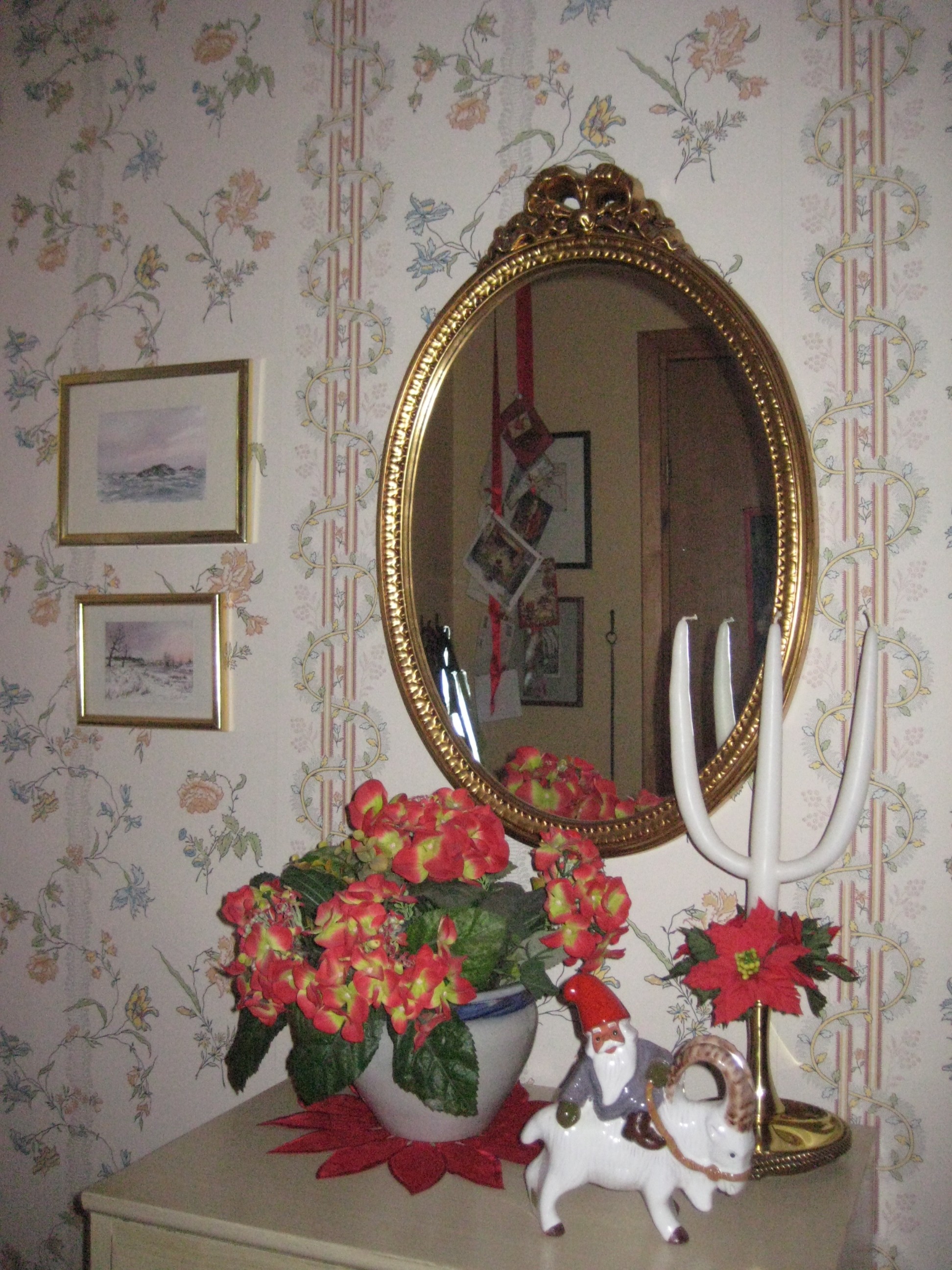 Idag är det Lillejulafton det vill säga dagen före julafton, det är då allt skall göras klart inför morgondagen. Värst är det nog för min systerdotter, hon skall tapetsera om ett vardagsrum idag, väl tufft tycker jag. Inte lätt heller när det handlar om en handgjord tapet som knappast är lättlimmad. Julen står i alla fall för dörren men hos oss hänger det en kvist på dörren kanske har den samma funktion.