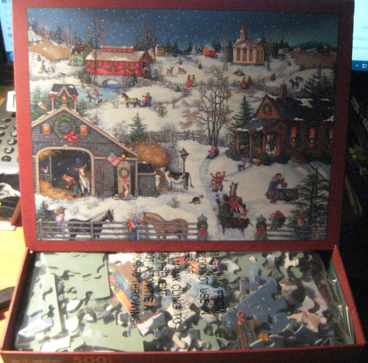 Därefter blir det en stund för pusslande, kunde inte låta bli att köpa detta pussel i USA, kanske mest för asken eftersom bilden Christmas Memories från Jigsaw Puzzle är så vacker.