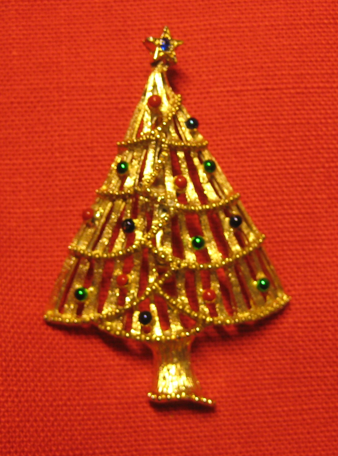 För att lätta upp stämningen tog jag fram lite som kan ”lysa” upp tillvaron. Den första saken är en brosch som jag är väldigt glad över och lite stolt för att jag har fått den. I USA har man under många år gett ut en brosch i form av en julgran, den har naturligtvis olika utseende för varje år. Har dessutom blivit ett samlarobjekt. Min systers barnbarns mormors mor (nu blev det svårt) samlade sådana under tiden 1955-1996. När jag kom till USA i oktober fick barnbarnet välja ut en brosch som hon kunde ge mig. Det blev denna.