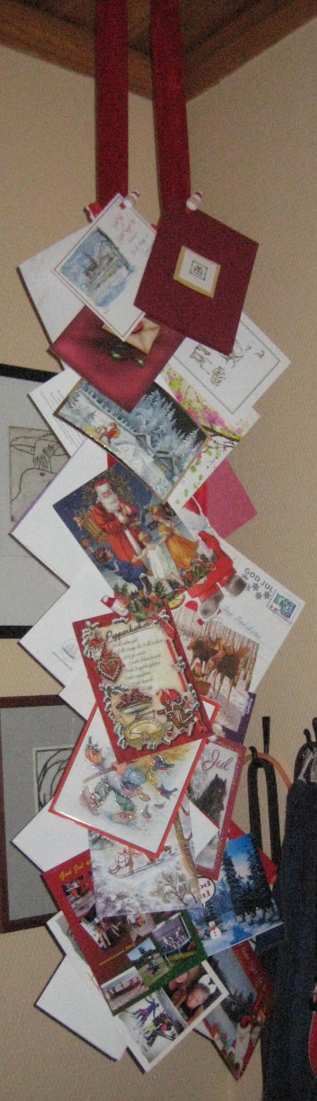 I år hittade jag så söta ”klädnypor med små tomtar på, perfekta att fästa fast korten på sidenbandet med. Att hänga ett sidenband med årets julkort är en tradition vi haft i massor med år.