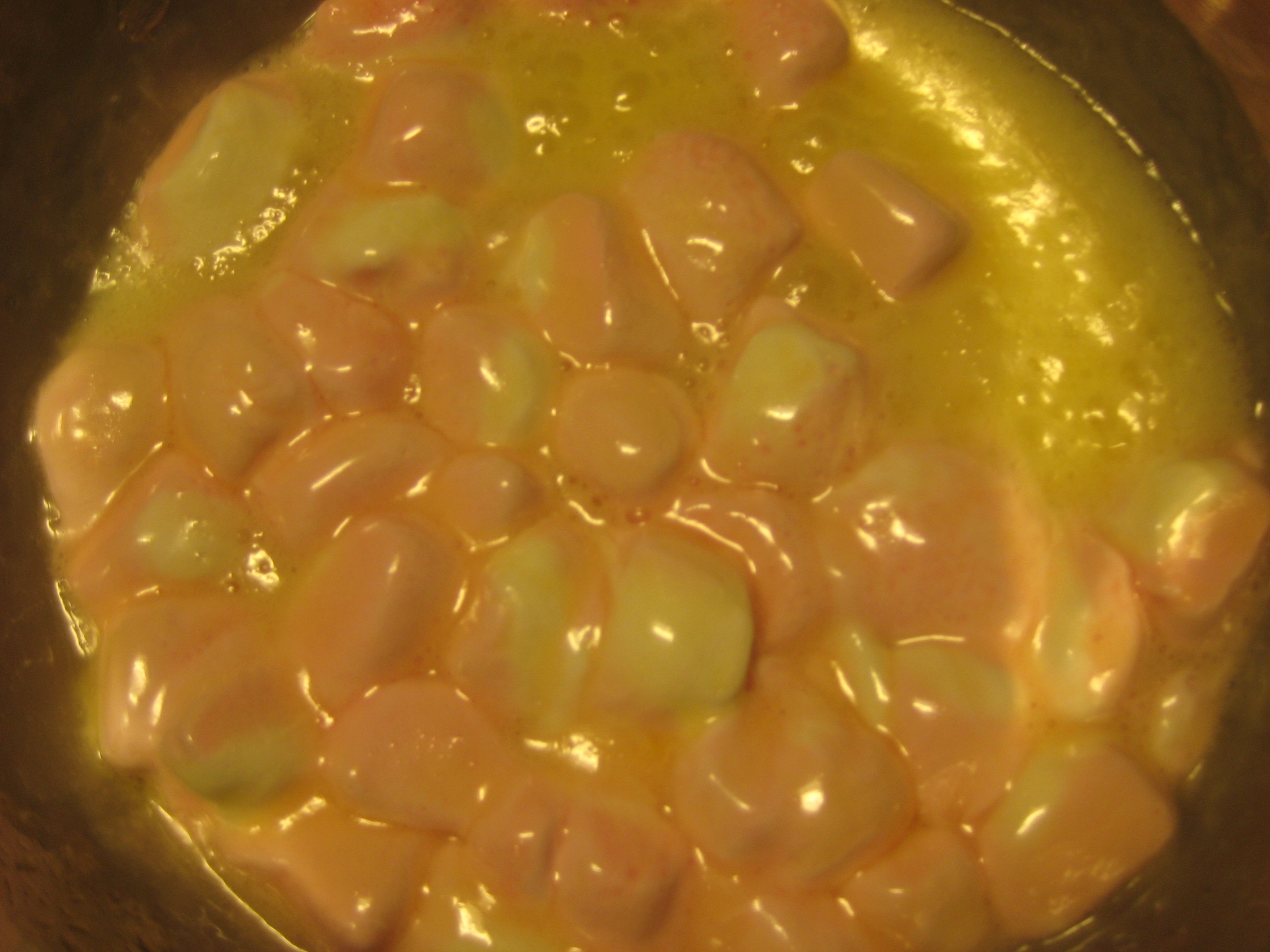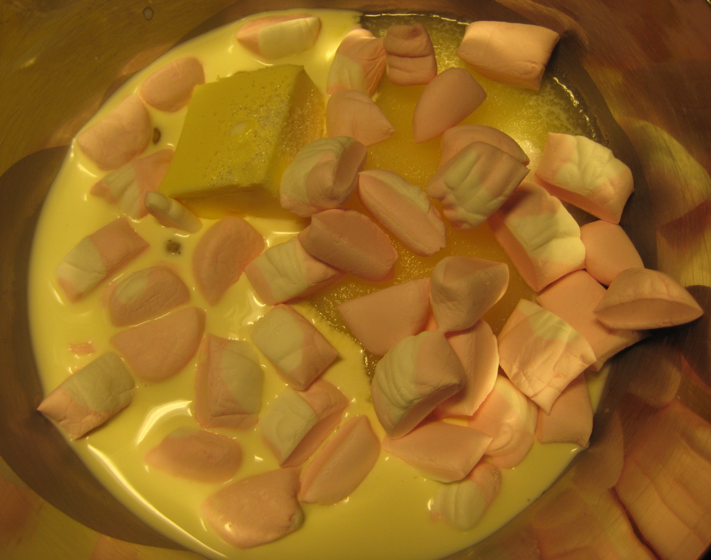 Klipper dem i bitar (låter lite grymt det här) lägger dem i en kastrull tillsammans med 50 gram smör och 2 dl strösocker samt 1 dl vispgrädde. Låt det smälta ihop och rör om, vill man ha mera färg kan man ha i ett par droppar karamellfärg.