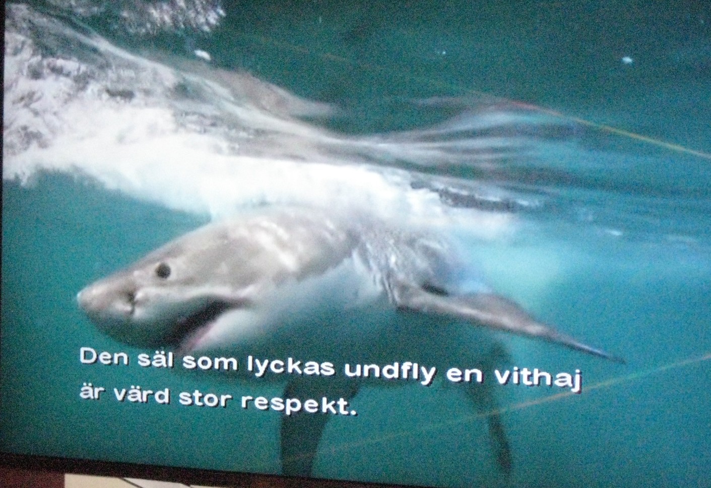 En liten säl blev jagad av en stor lömsk vithaj, sälen var tillräckligt smart för att undkomma. Han simmade nämligen nära båten där Steve och fotograferna var och de bogserade honom till ett område där det växte mycket alger. Väl där kunde han skydda sig för hajen som inte gärna simmar in där, så slutet gott allting gott för denna gång.