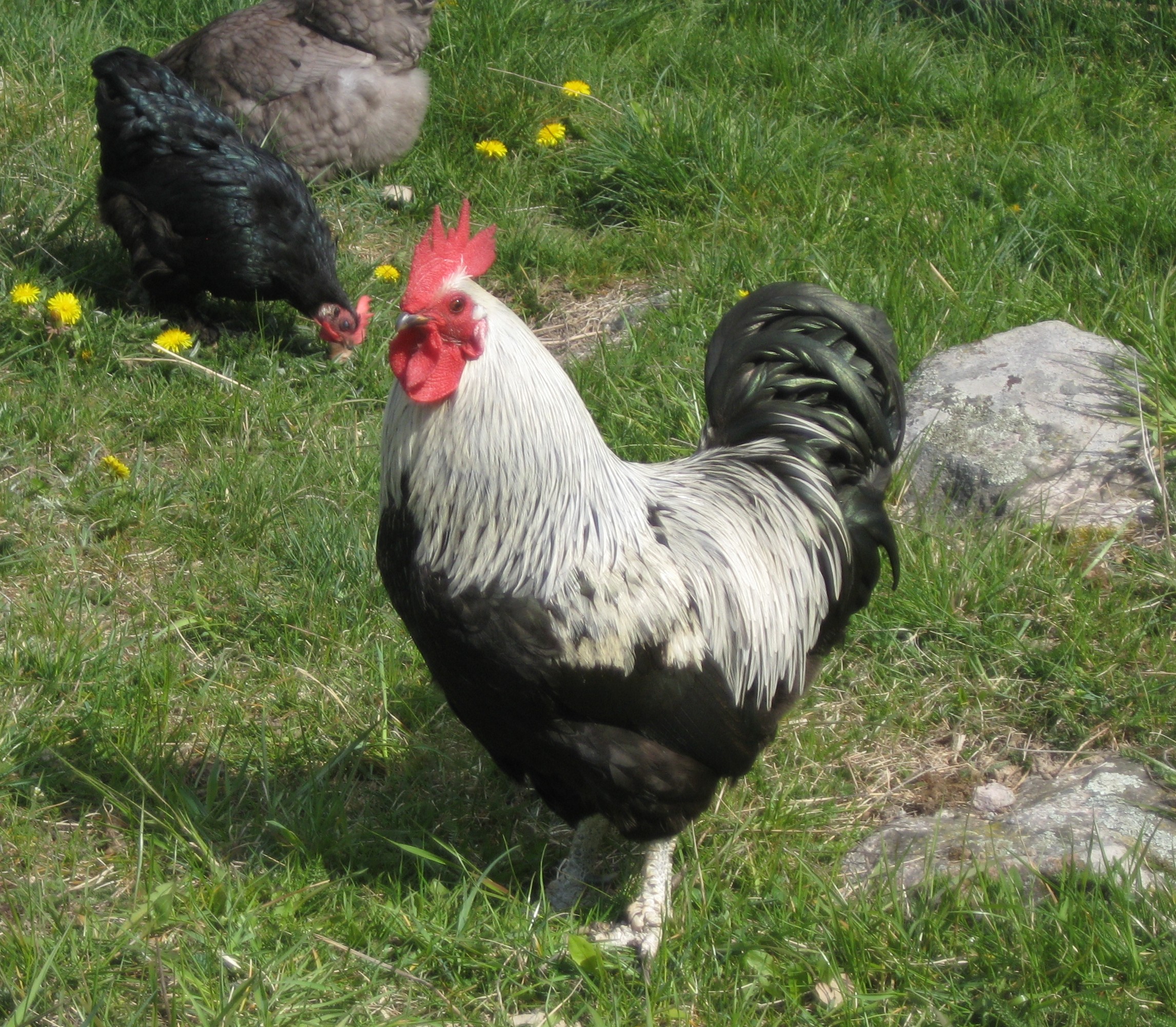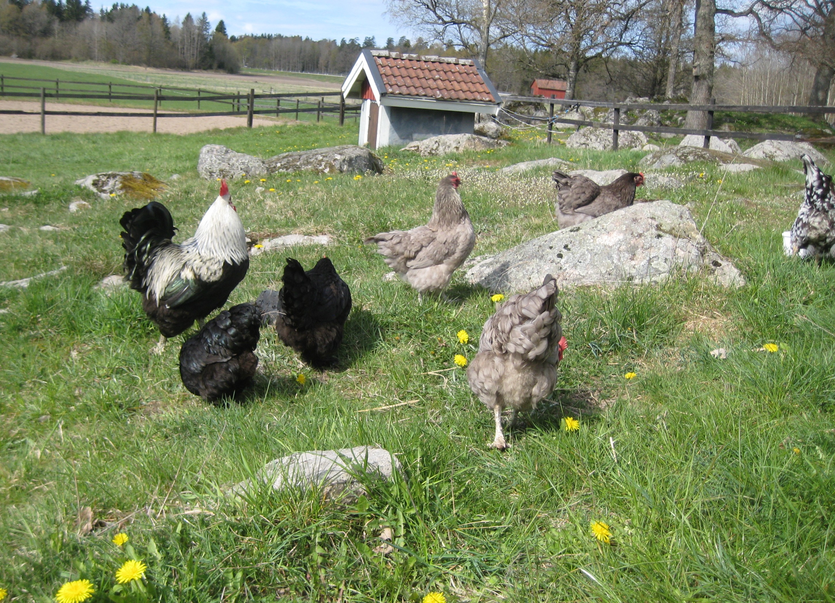 I en hönsgård finns det oftast en tupp, så även här och det var en riktig gentleman som alltid lät hönorna äta först när det vankades mat. Tuppen själv såg ut som om han just var utstigen från ett påskkort av Jenny Nyström.