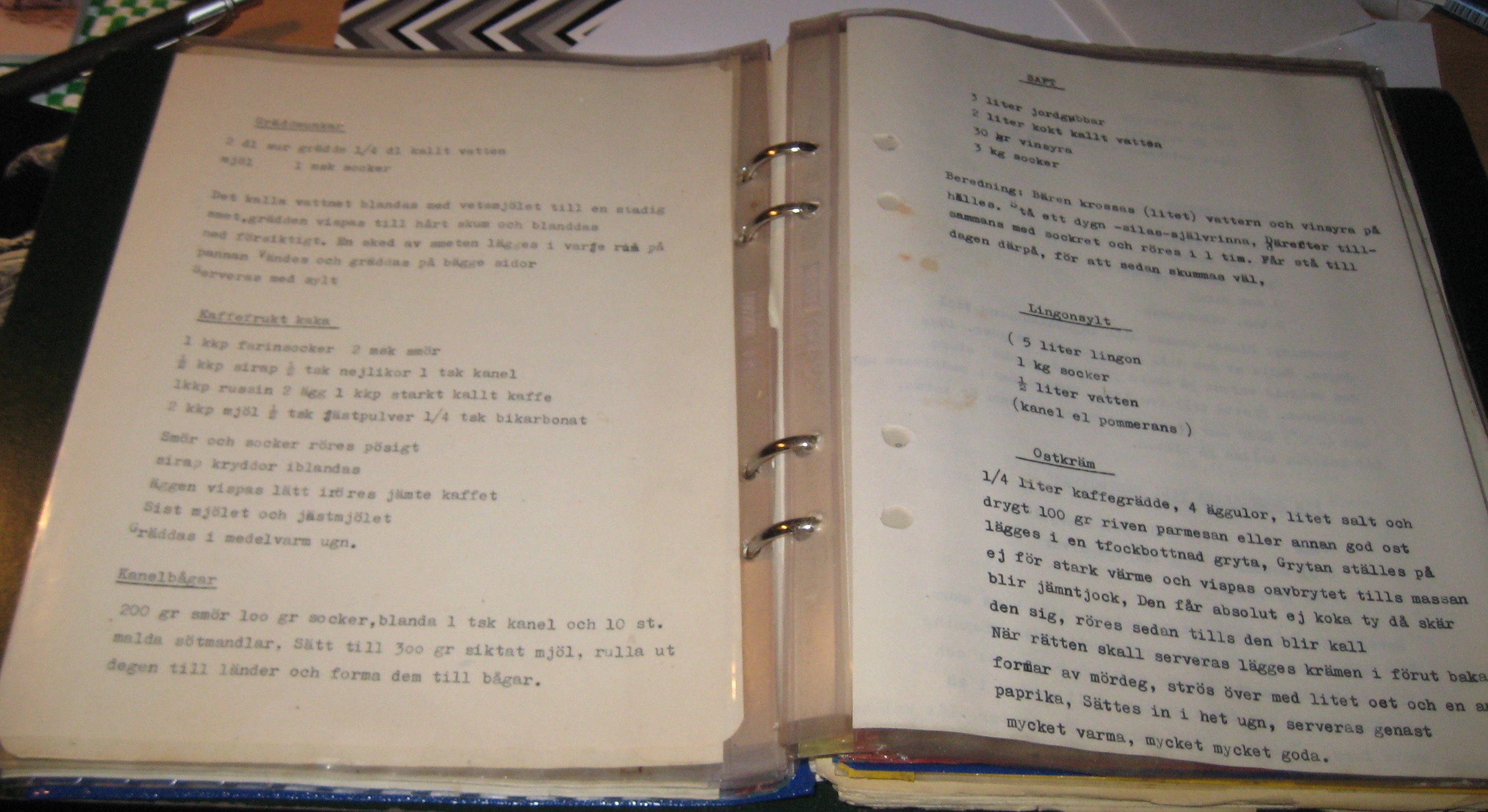 Jag säger bara ”Mammas anteckningsbok” den innehåller en massa recept på mat med tradition. Den innehåller även en hel del historia från hennes mammas tid, vi pratar början på 1900-talet. Historien kan man utläsa i recepten och dess ingredienser, ett exempel är fisksoppa. När man rensat en fisk och har bara skrovet kvar, då används fiskköttet till middag ena dagen och fiskrenset kokas i vatten till buljong. Därefter reder man av det till en lagom simmig soppa, om man har lägger man i dill eller brödtärningar. Det blir en middag till. Av detta kan man utläsa vilken tid vi pratar om, vilken samhällsklass vi befinner oss i, var i landet man bor med mera. En intressant läsning i synnerhet nu när jag är så trött på allt trendigt.