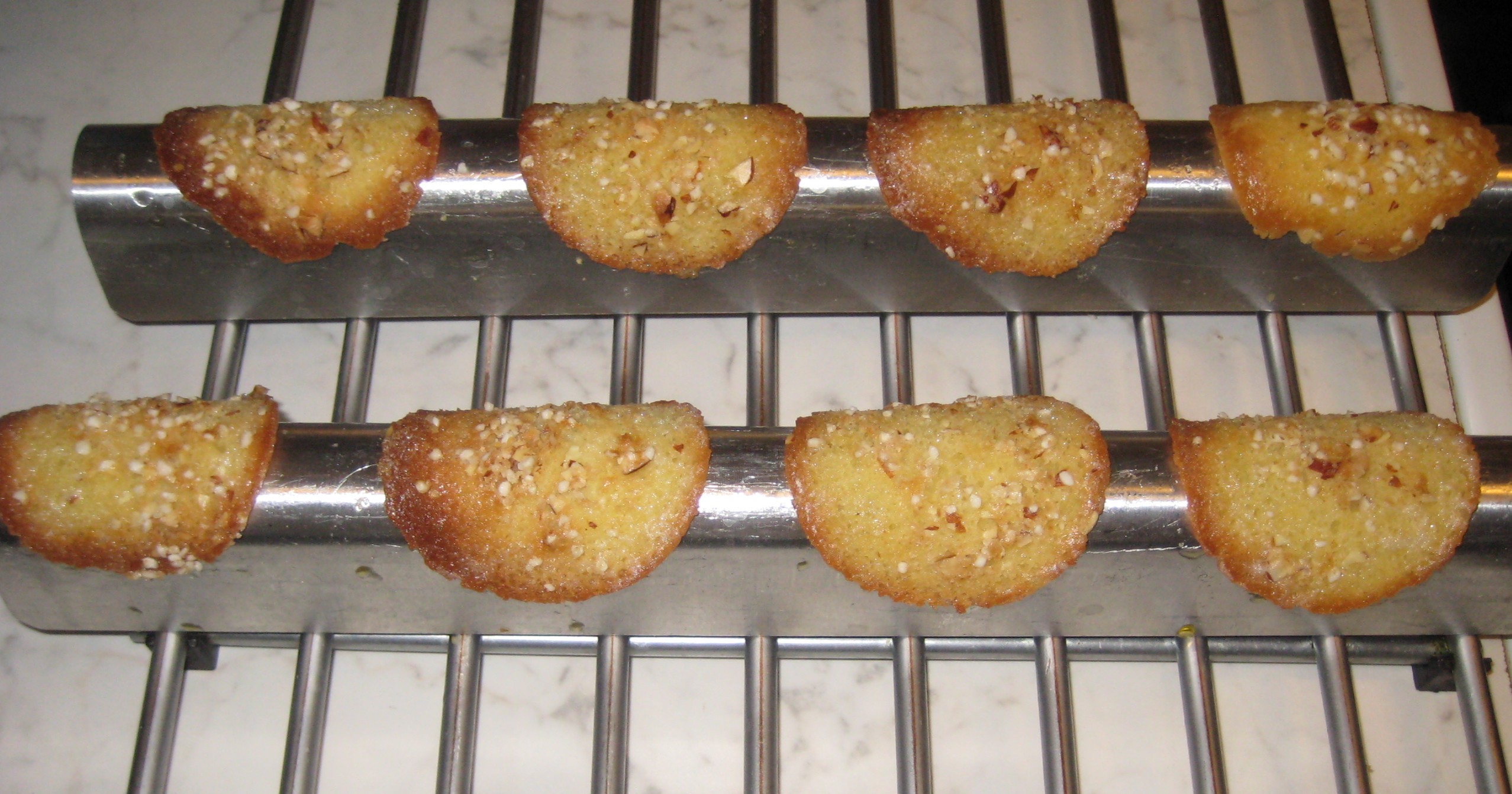 Smält 100 gram margarin, låt det kallna och rör det sedan poröst. Blanda i 1 ägg och 1 dl florsocker, rör det slät och häll slutligen i 1 dl vetemjöl och rör. Lägg 1/2 msk smet i varje rundel på plättlaggen och strö på hackad mandel och pärlsocker. Grädda dem i 225 graders ugn cirka 5 – 8 minuter tills de är ljusgula. Lossa dem genast och böjde dem över en brödkavel, liten flaska eller annat. Glöm inte att plättlaggen måste kallna emellan.