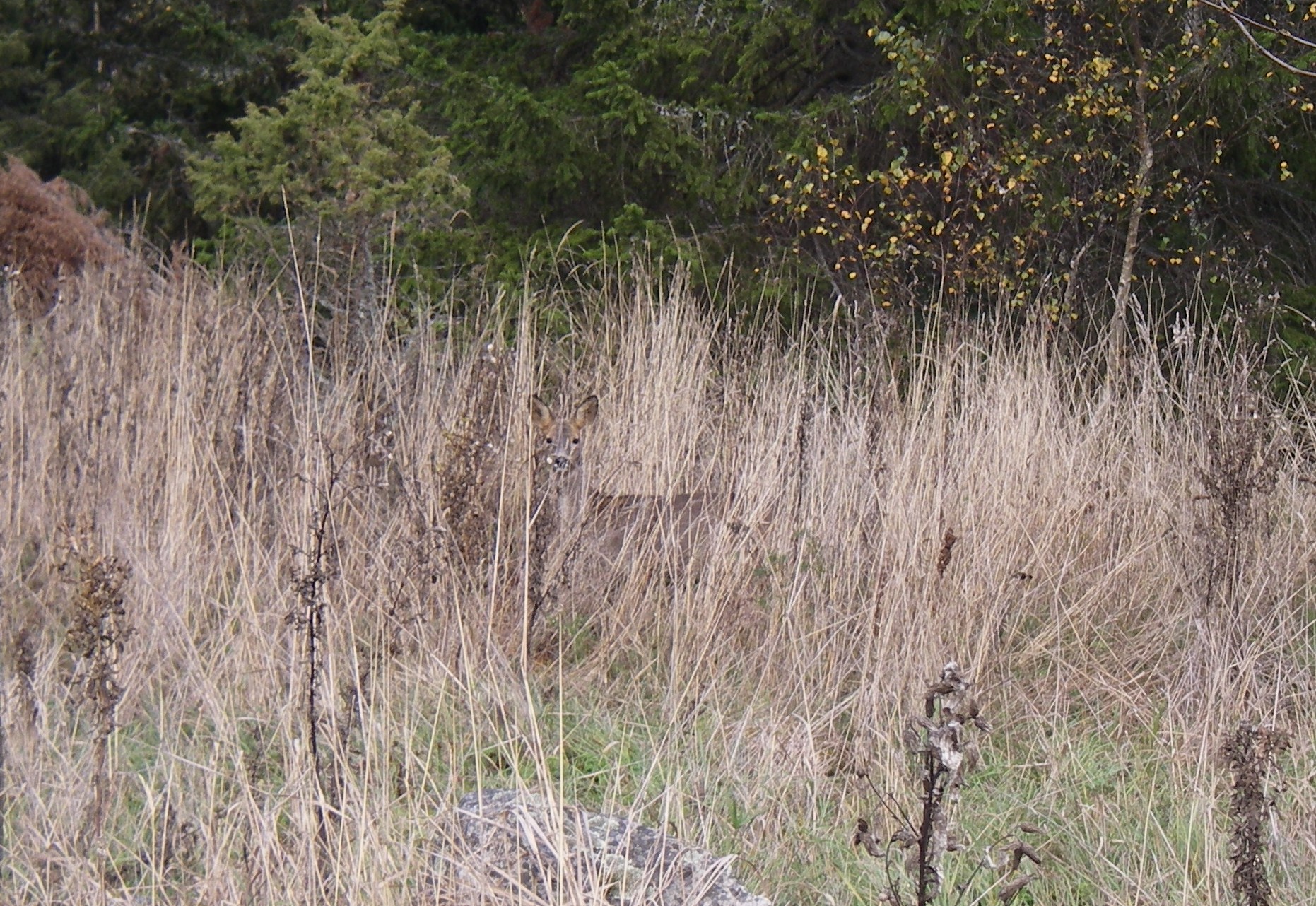 Hunden reagerade inte, så heller inte rådjuret varför jag fick gott om tid att ta ett foto. Smälter väl in det höga gräset men om ni tittar mitt på kortet ser ni det.