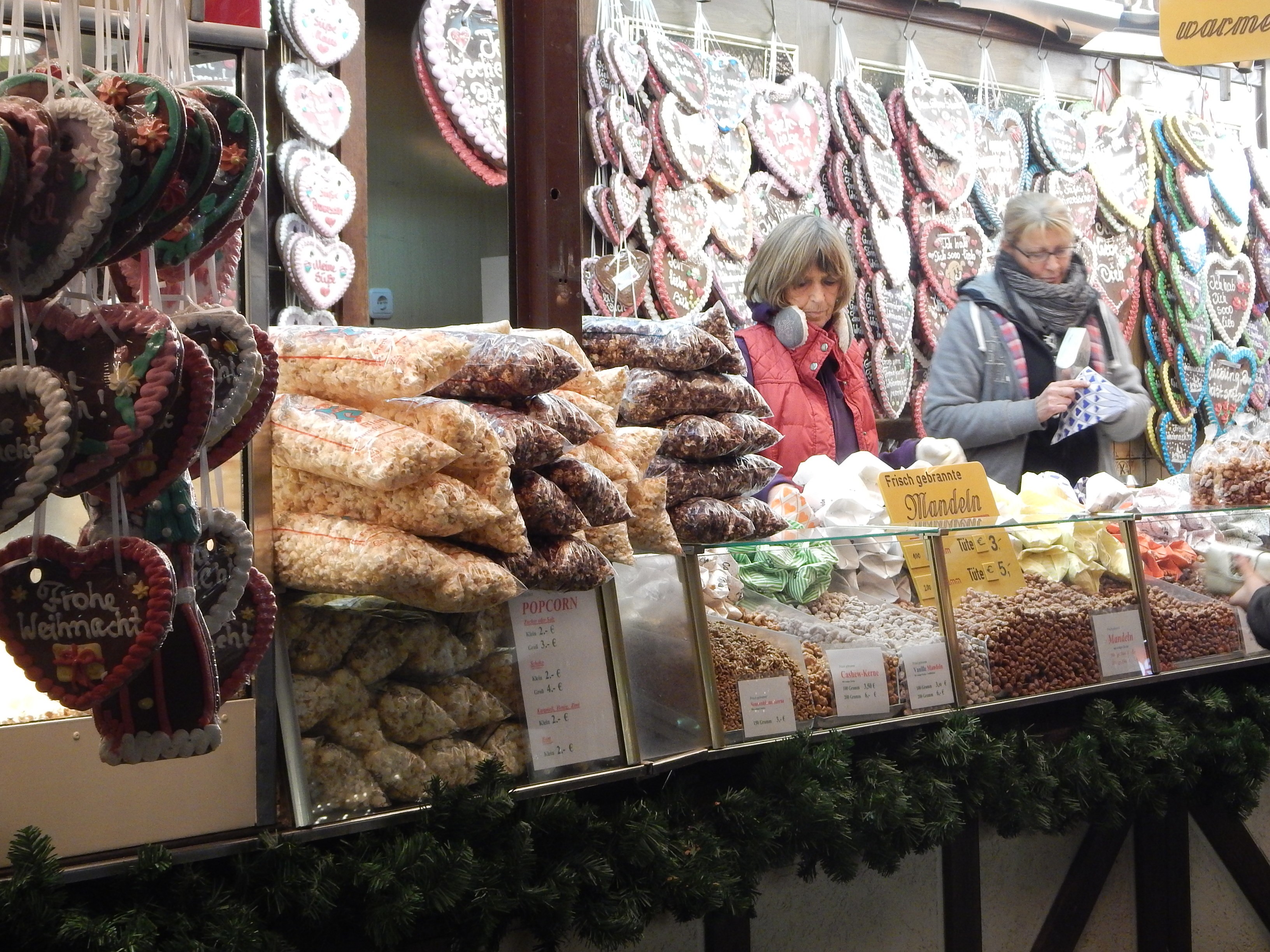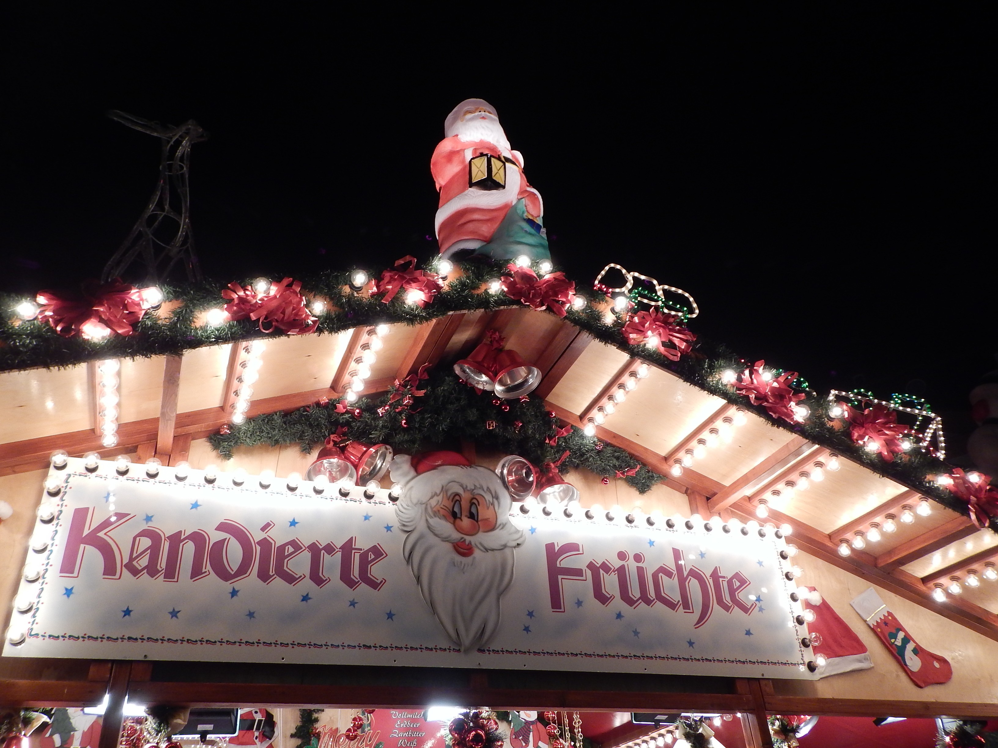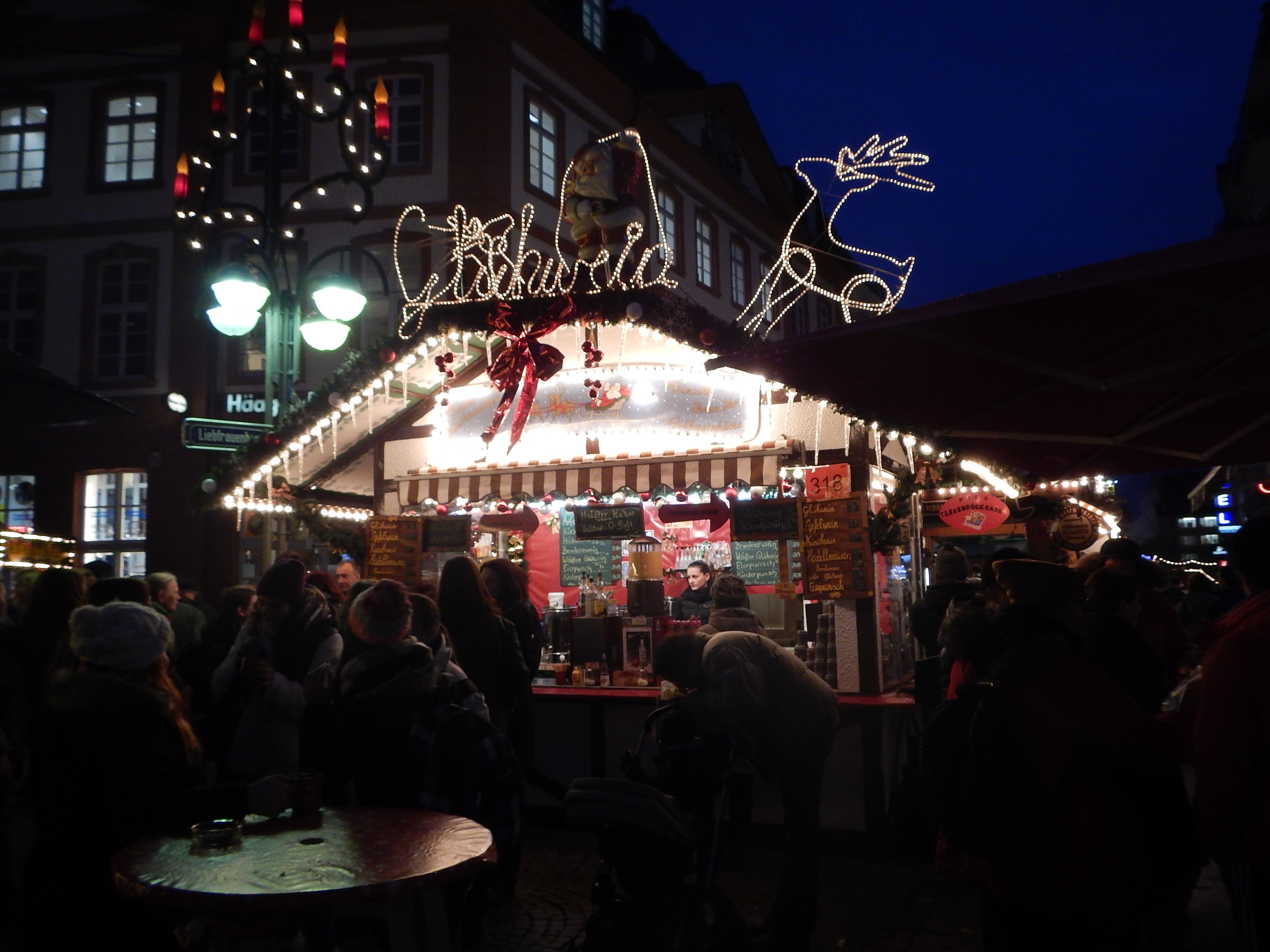 När vi bestämde oss för att åka några dagar till Tyskland för att besöka en julmarknad valde vi Frankfurt. En stad där vi endast passerat som hastigast samt att den ligger lite längre ner i landet än de marknader vi besökt där tidigare. Frankfurt är ju en mycket gammal stad som enligt en skrift kan dateras så långt bak som till 794. Utvecklades sedan allt eftersom till att bli en riktig handelsstad och på 1100-talet lockades affärsmännen till stadens marknader. Det är även den staden som har den längsta traditionen av att anordna julmarknad varje år. Gjorde den upptäckten att julmarknaderna skiljer sig något mellan städerna, nu kan jag bara jämföra med Lübeck och Berlin förstås. Mat är det dominerande inslaget på en tysk julmarknad så vi startade med en Bratvurst, Rolf ser dock något fundersam ut.