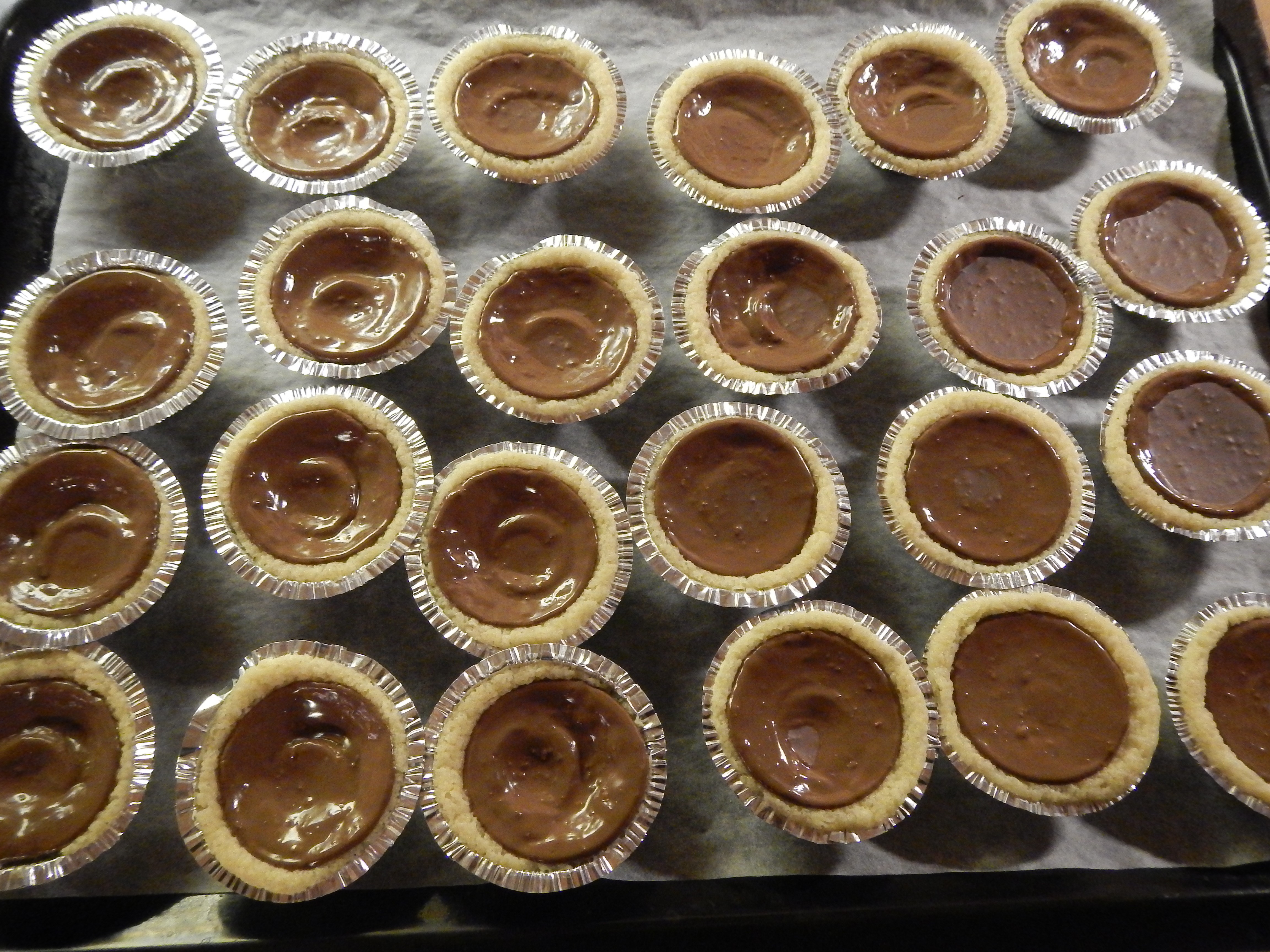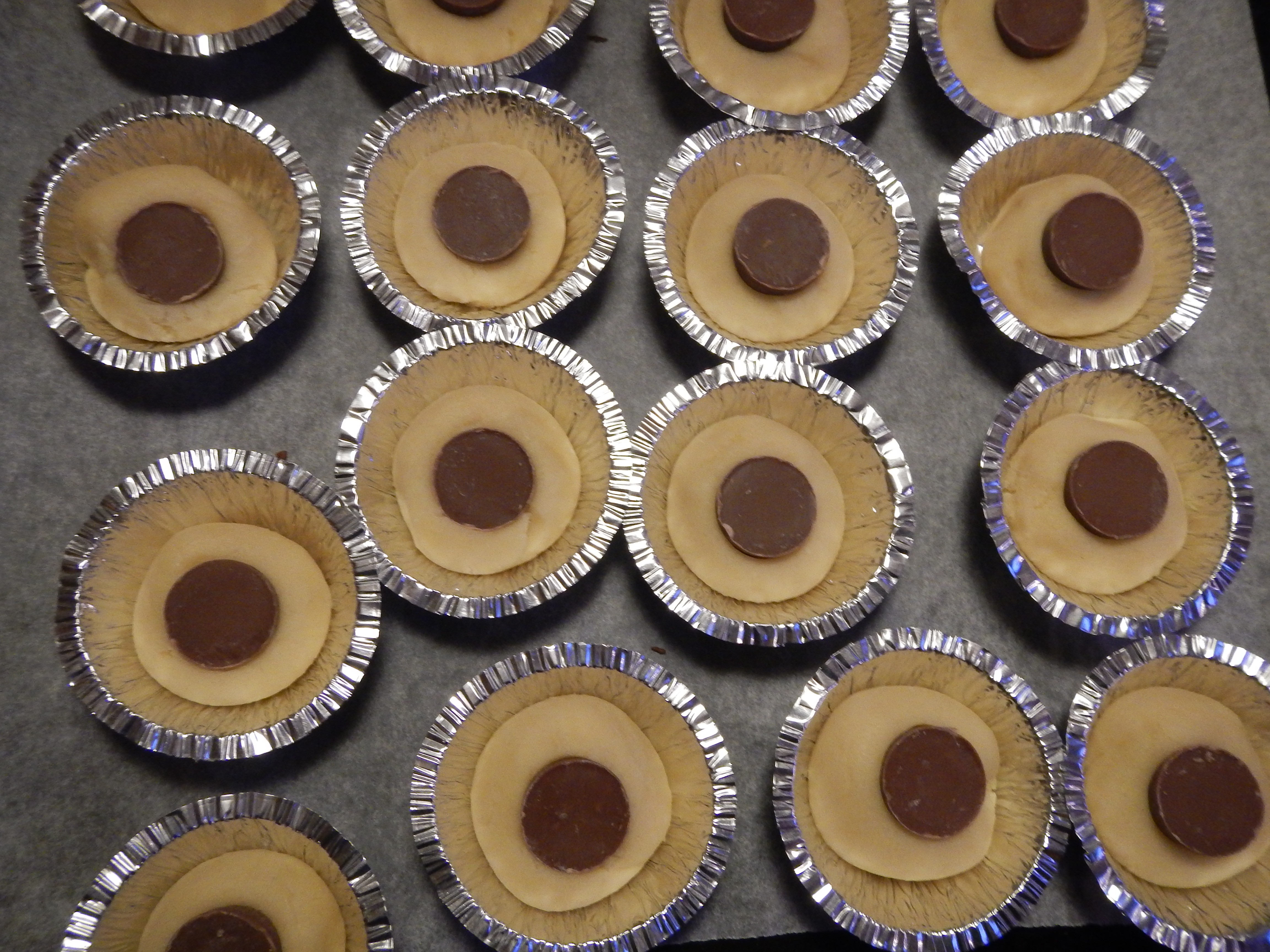 Recept, Blanda 200 gram margarin, 1 dl socker, 3 dl vetemjöl och 1 tsk bakpulver i en matberedare eller för hand. Låt degen vila i kylskåp en halvtimma. Knåda den lite och fördela den i 24 bitar som rullas till bollar och läggs i aluminiumformar.