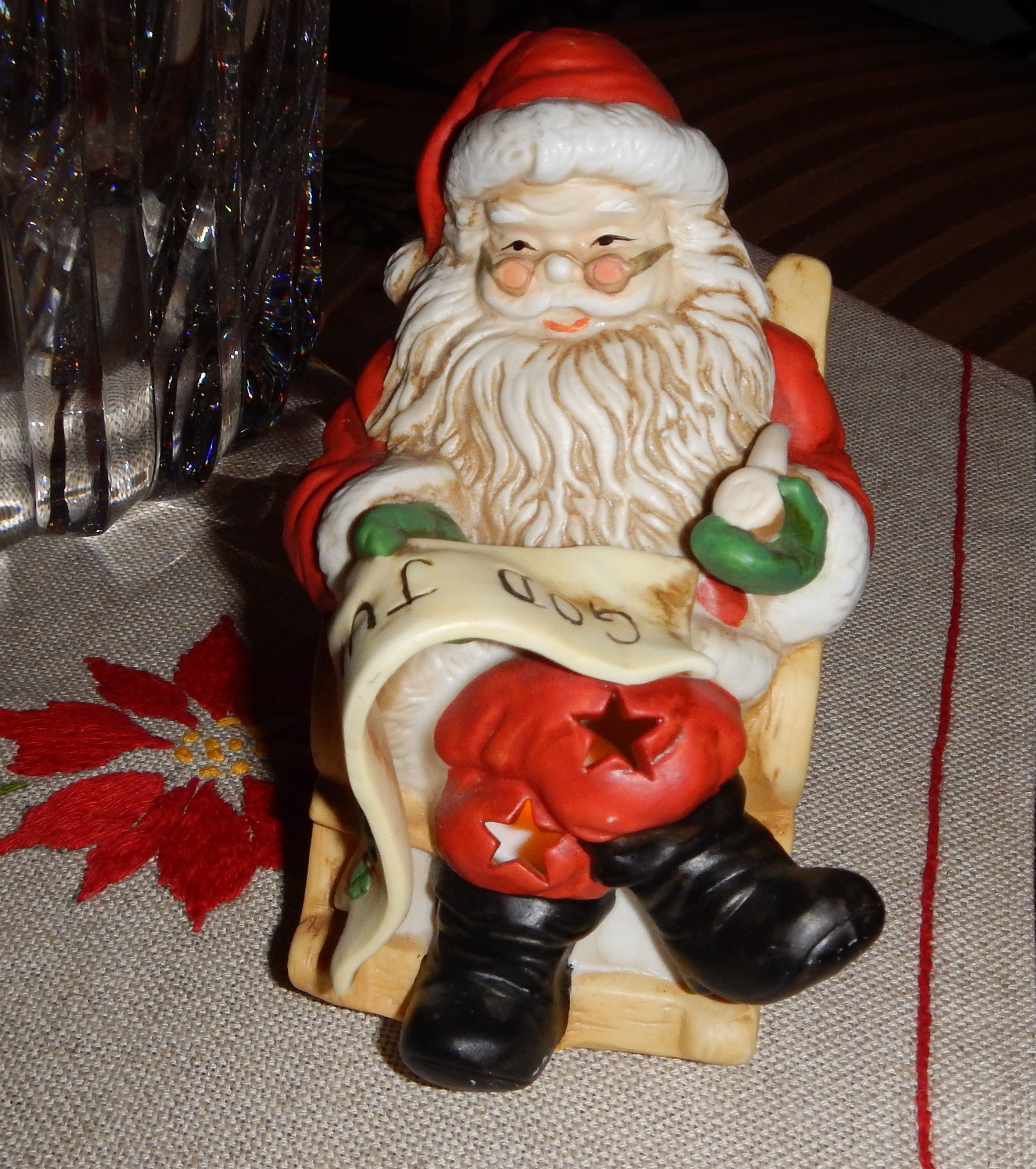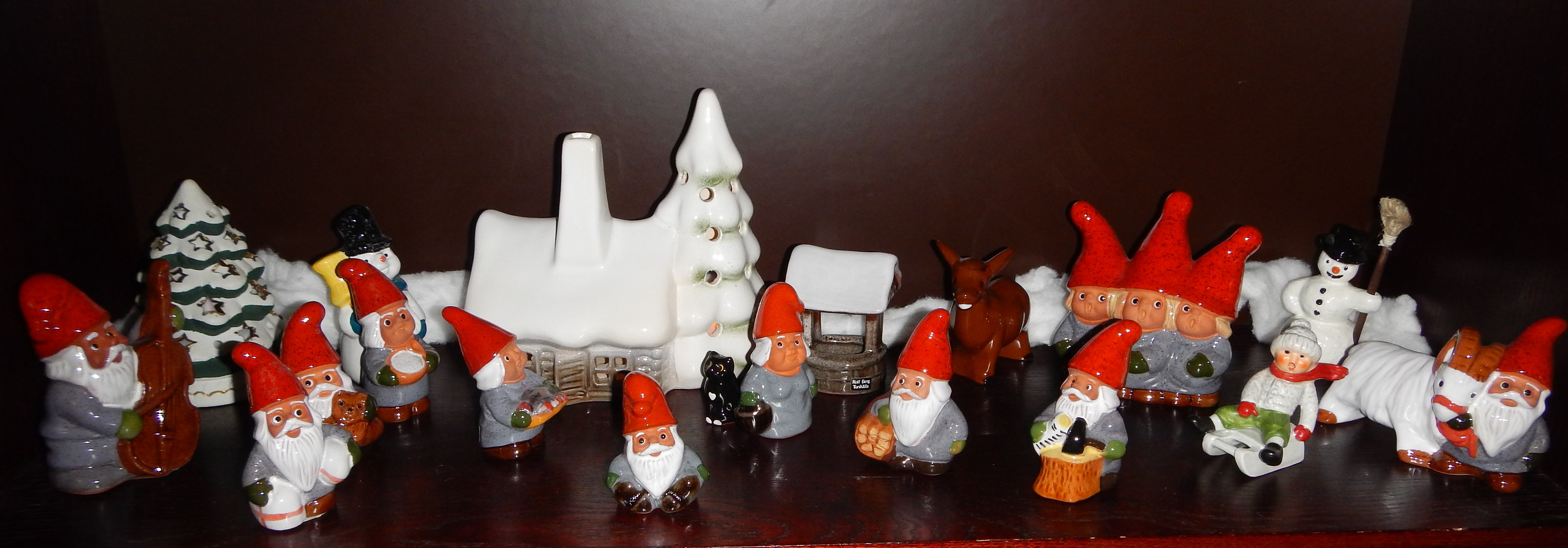 En tomte som man sätter ett värmeljus i är en annan favorit, fast numera har jag laddningsbara ljus i den. Den fick jag av min mamma en jul för 18 år sedan när jag var sjuk, den sprider mycket ljus o värme. Det blev en nostalgisk dag men i positiv riktning, nu väntar vi bara på snön sedan är allt klart för den stundande helgen. Snön måste ju komma annars blir det svårt för Santa att köra släden med renarna.