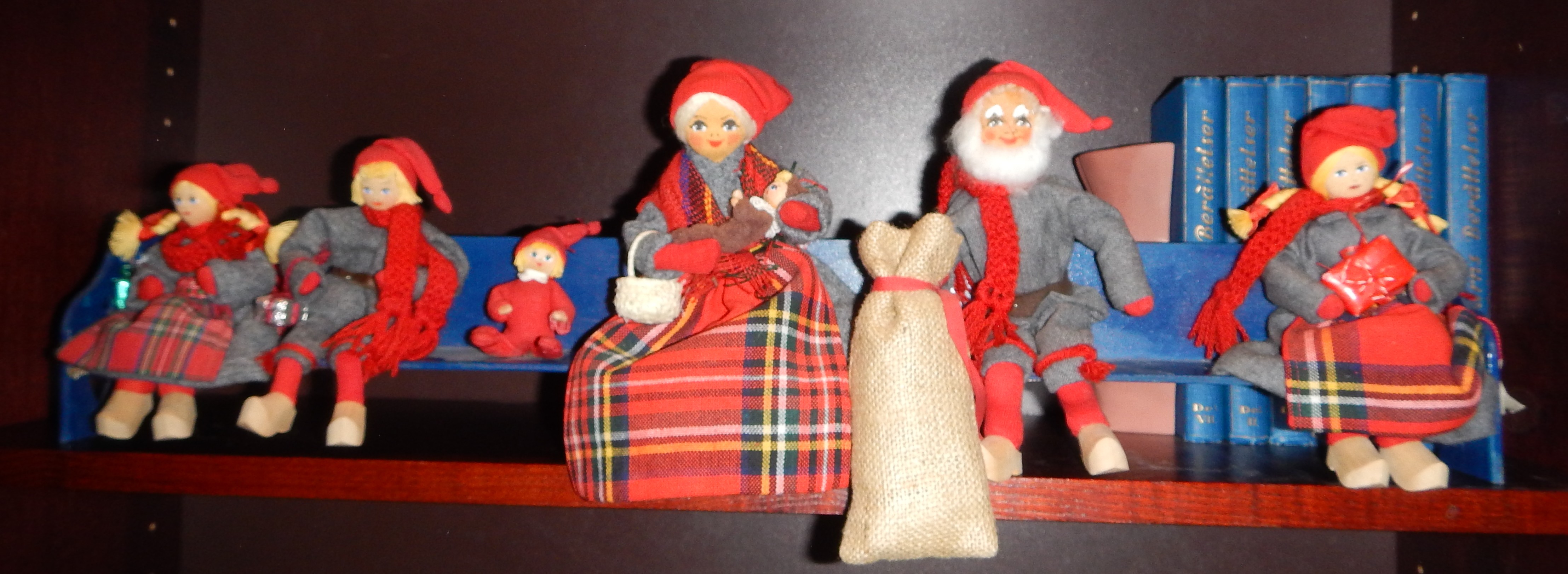 Här hemma har vi redan pyntat klart, jag är ganska förtjust i julsaker o det skall gärna fördelas över hela huset. Det infinner sig dock alltid en viss sentimental känsla när sakerna tas fram och olika minnen gör sig påminda. Den här soffan med tomtefamiljen har vi fått av goda vänner och det är nog runt 37 år sedan, för oss en dyrgrip. Den är dessutom gjord av Charlotte Weibull.